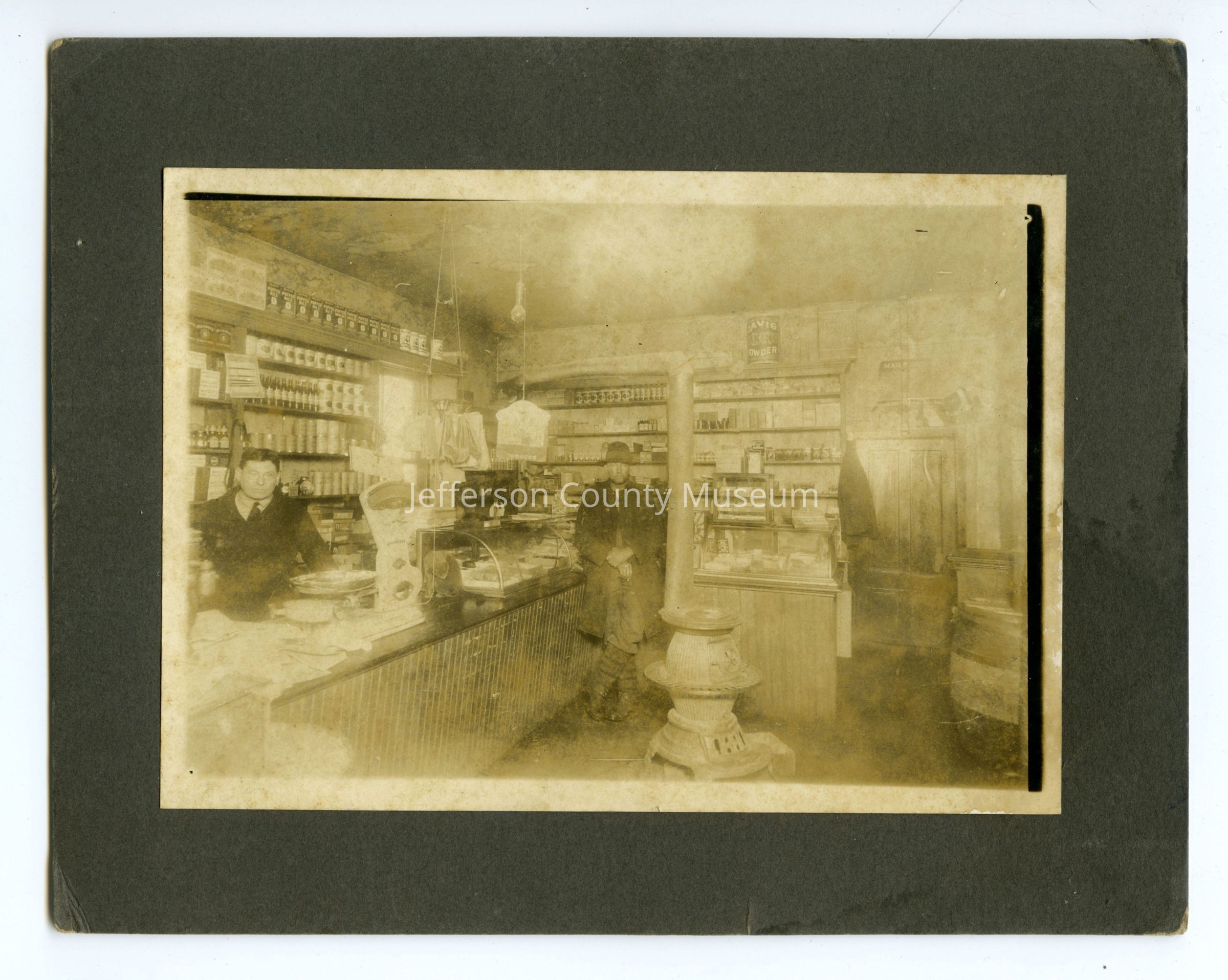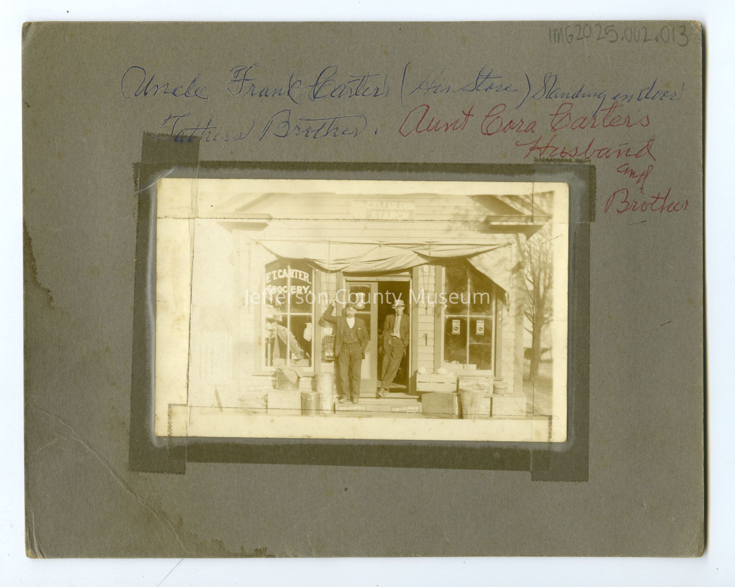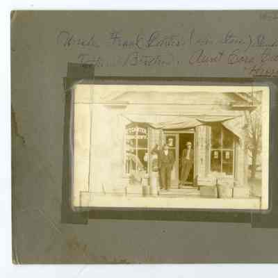 Two (2) black and white photos mounted on either side of a piece of cardboard. On one side is an image of the interior of Frank Carter's grocery store, with Carter at left and an unknown man standing in the middle near the stove. Many products can be seen on display along the walls. On the reverse side is an exterior photo, with Carter and another man (probably his brother) standing in the doorway. Several advertisements for products can be seen as well as a raised awning and the lettering "F.T. Carter Grocery" in the window. Written in pen above the image is "Uncle Frank Carter (His Store) Standing in a door/ Father's Brother. Aunt COra carter's Husband and Brother."Context