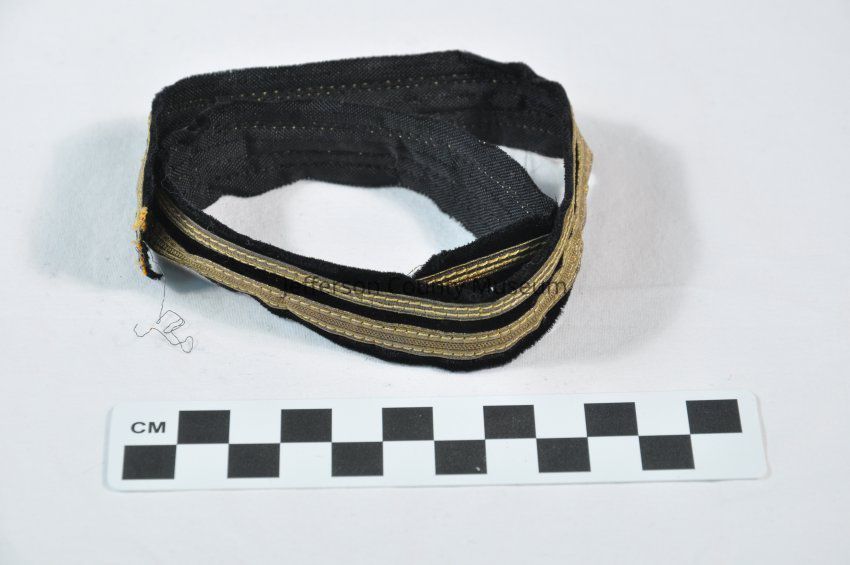 Length of braid from U.S. Navy uniform. Braid is black or dark blue plush with two strips of gold braid sewn lengthwise.Acquisition