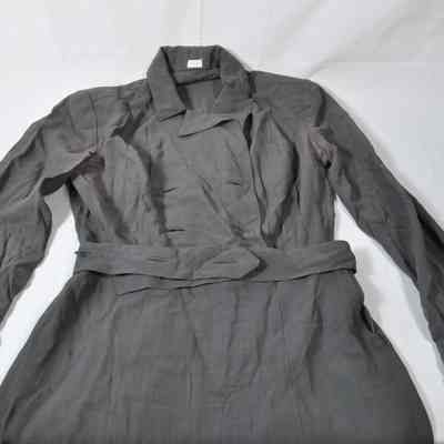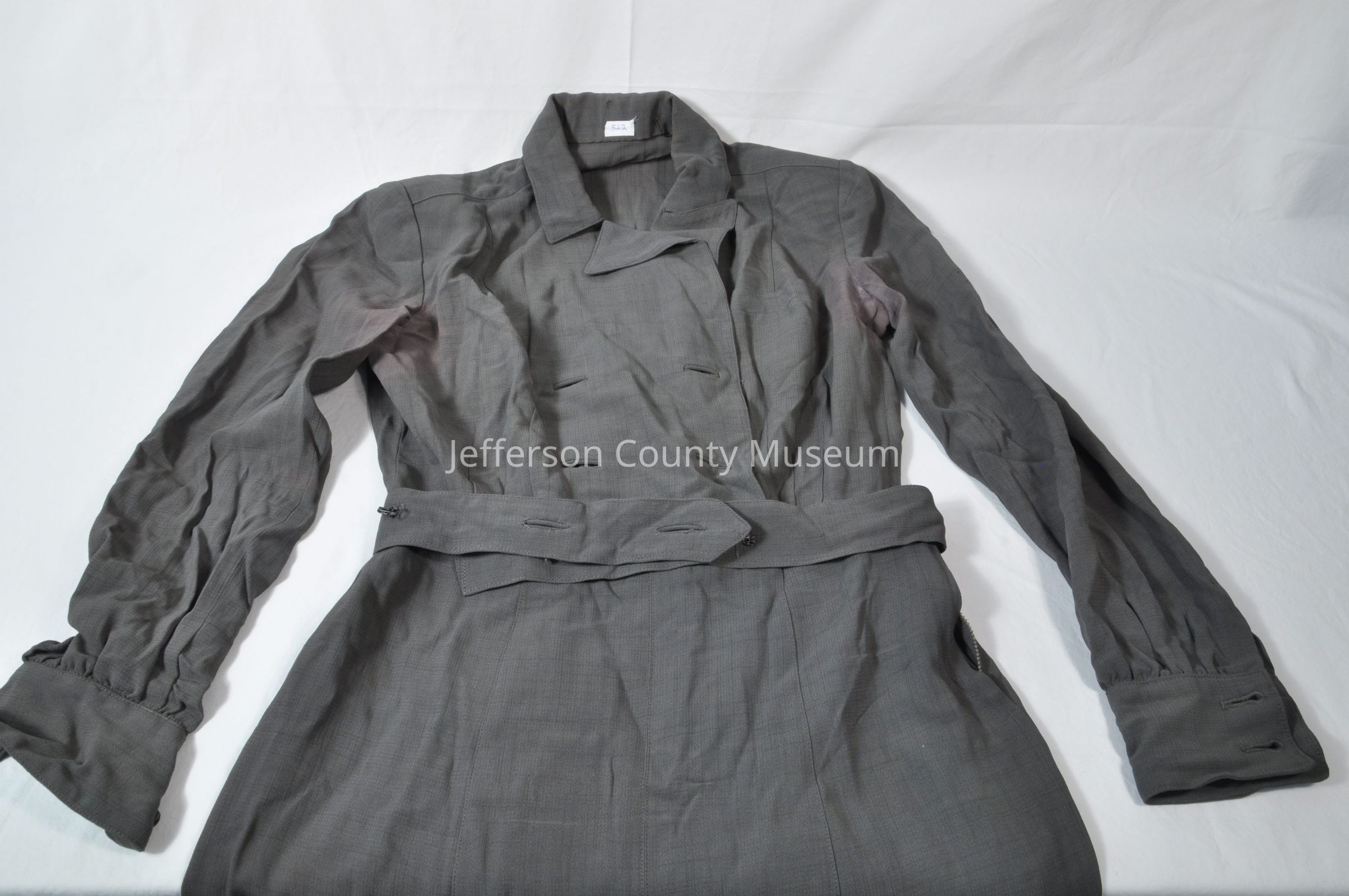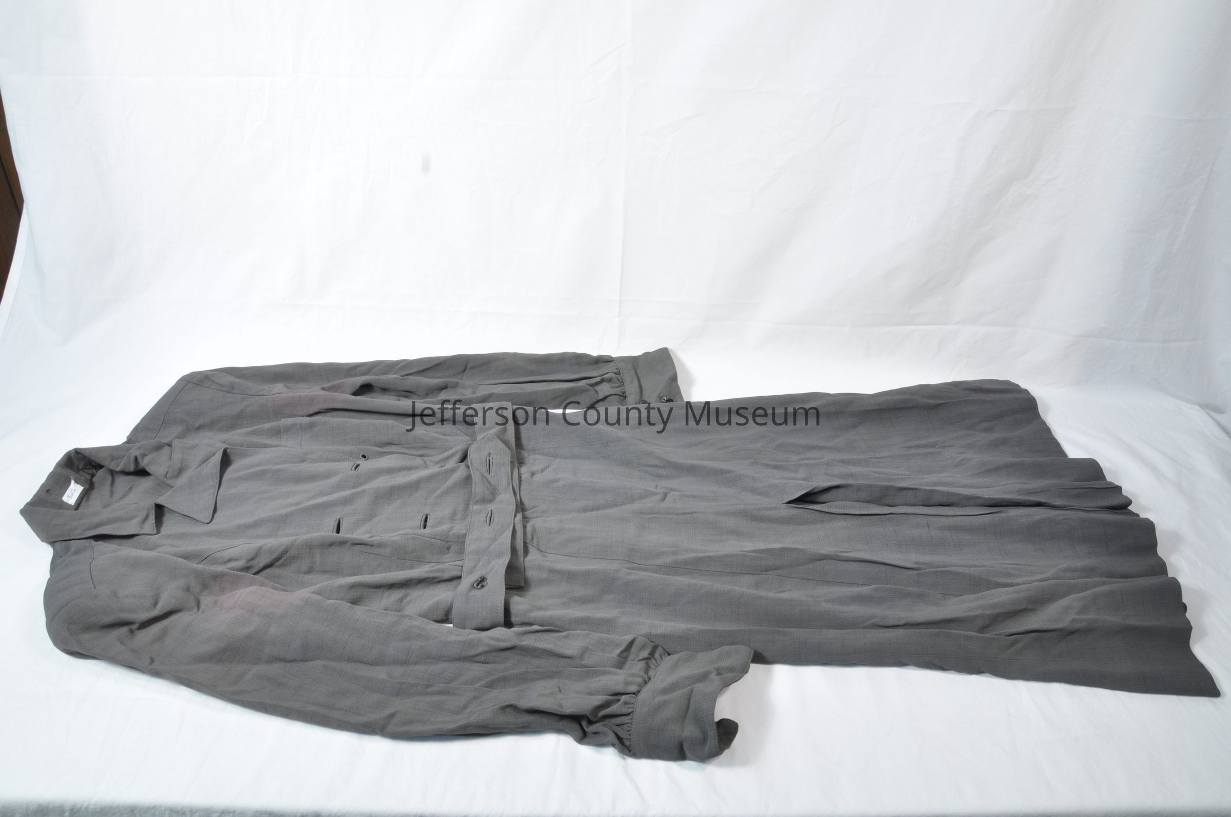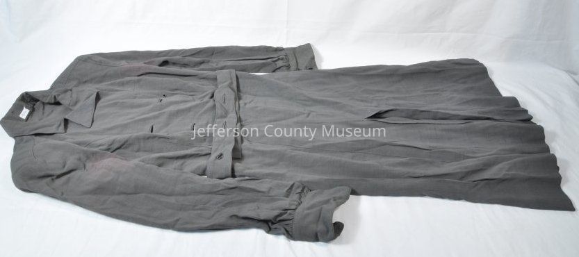 U.S. Navy uniform dress. Gray cotton twill. Long-sleeved with cuffs; cuffs have two black shank-type buttons with eagle insignia. Left side zipper; front opening down to waist is double-breasted and had four shank-type buttons which are missing. Self-fabric belt had two buttons which are missing. Left breast pocket. Shoulder padsAcquisition