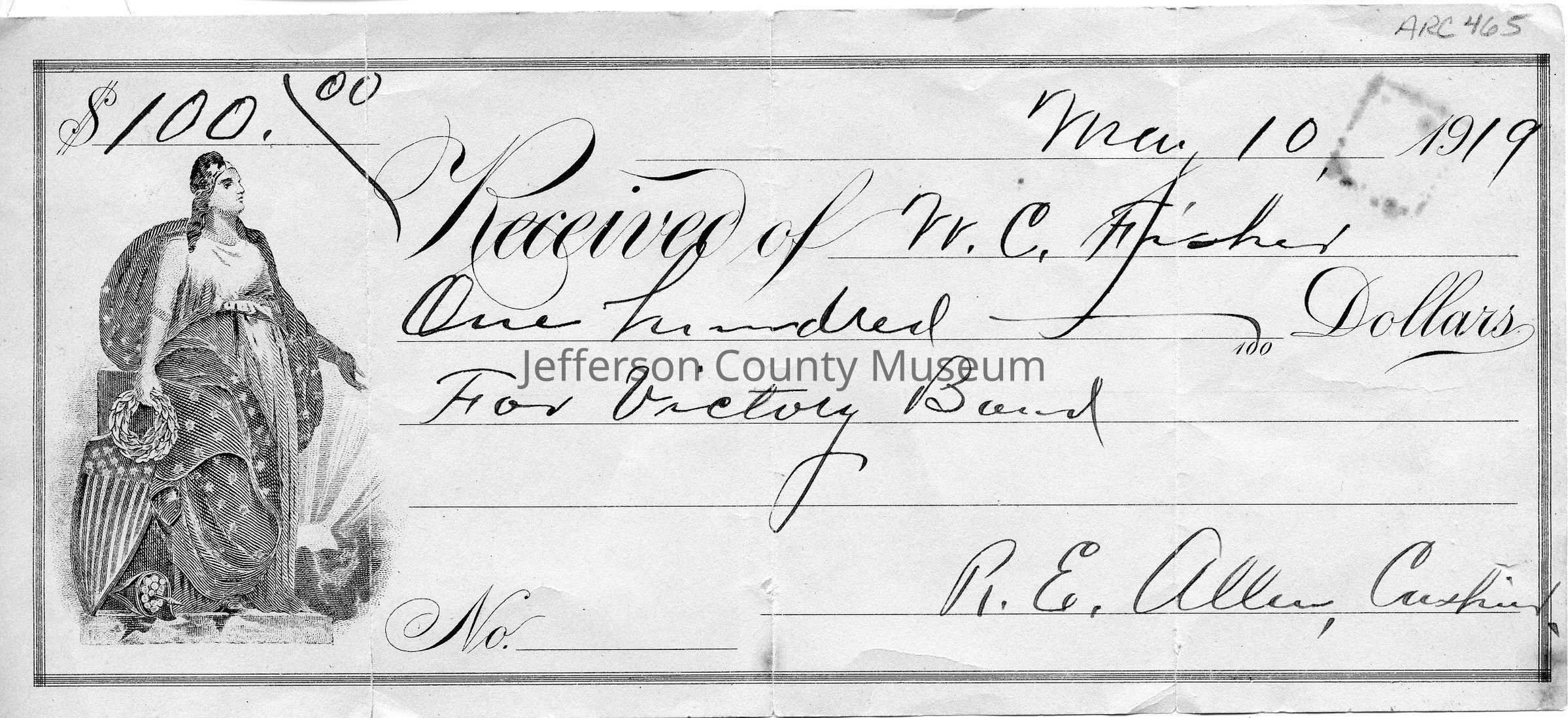 World War I Victory Bond, dated May 10, 1919. "Received of W. C. Fisher One hundred Dollars For Victory Bond". Signed "R.E. Allen, Cashier".Acquisition
