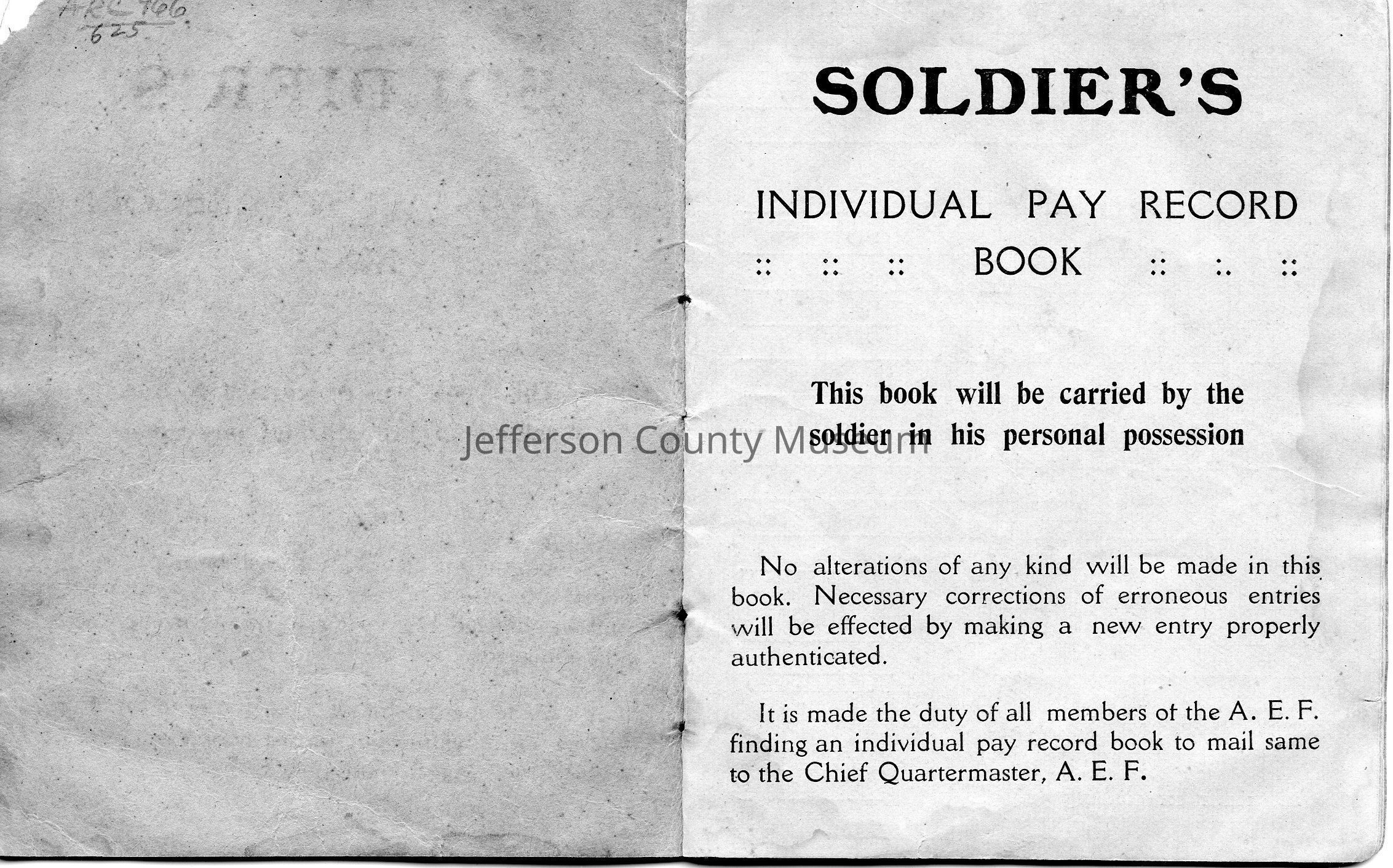Black leatherette bound. Soldier's Individual Pay Record Book for "Noel R. Burton, Private, Co. 'F' 318th Infantry". Opening date January 1, 1919; last entry is May 1, 1919. Belonged to Noel R. Burton.Acquisition