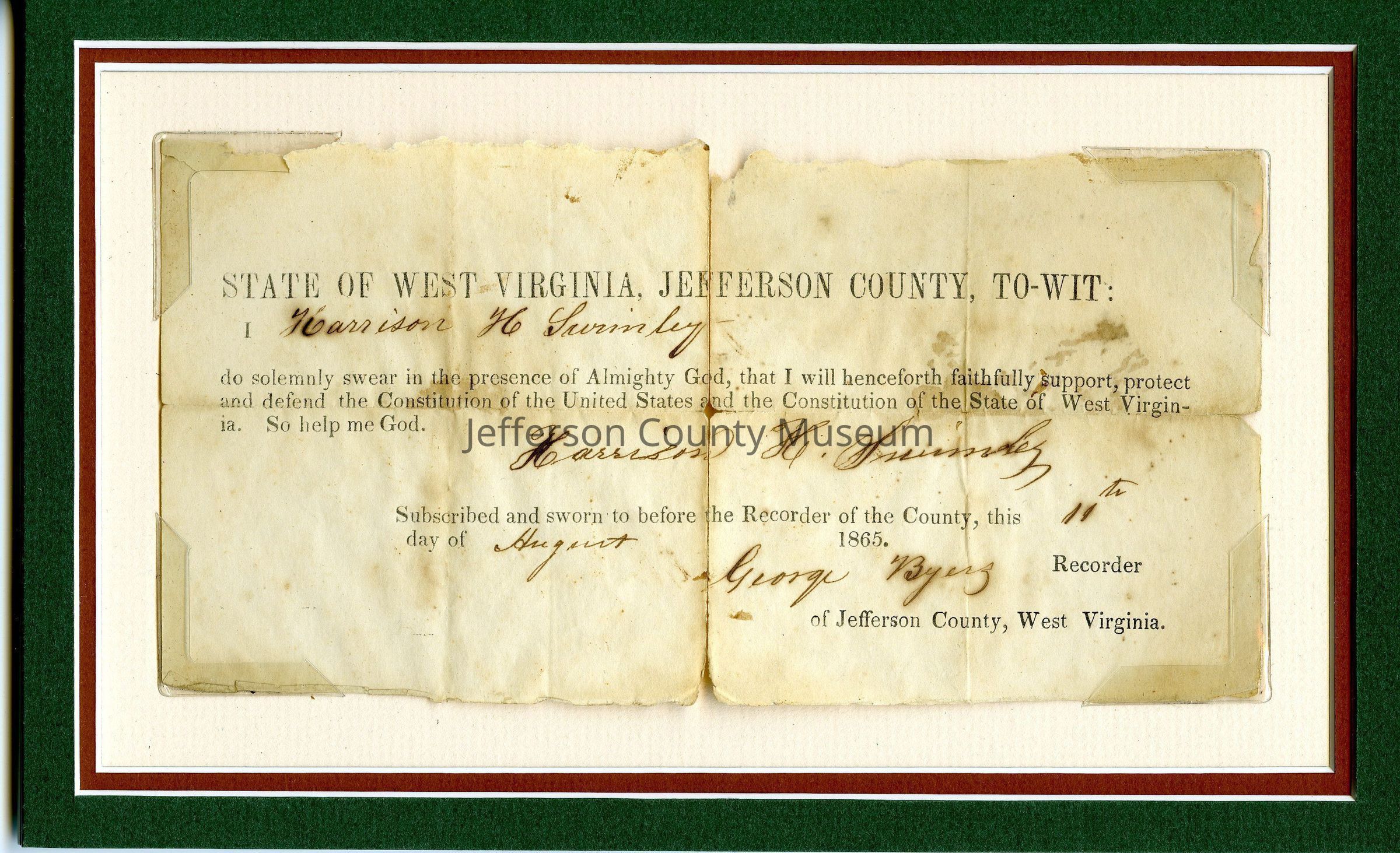 Oath of Allegiance for Harrison H. Swimley, August 11, 1865. Signed by George Byers, Recorder of Jefferson County.Acquisition