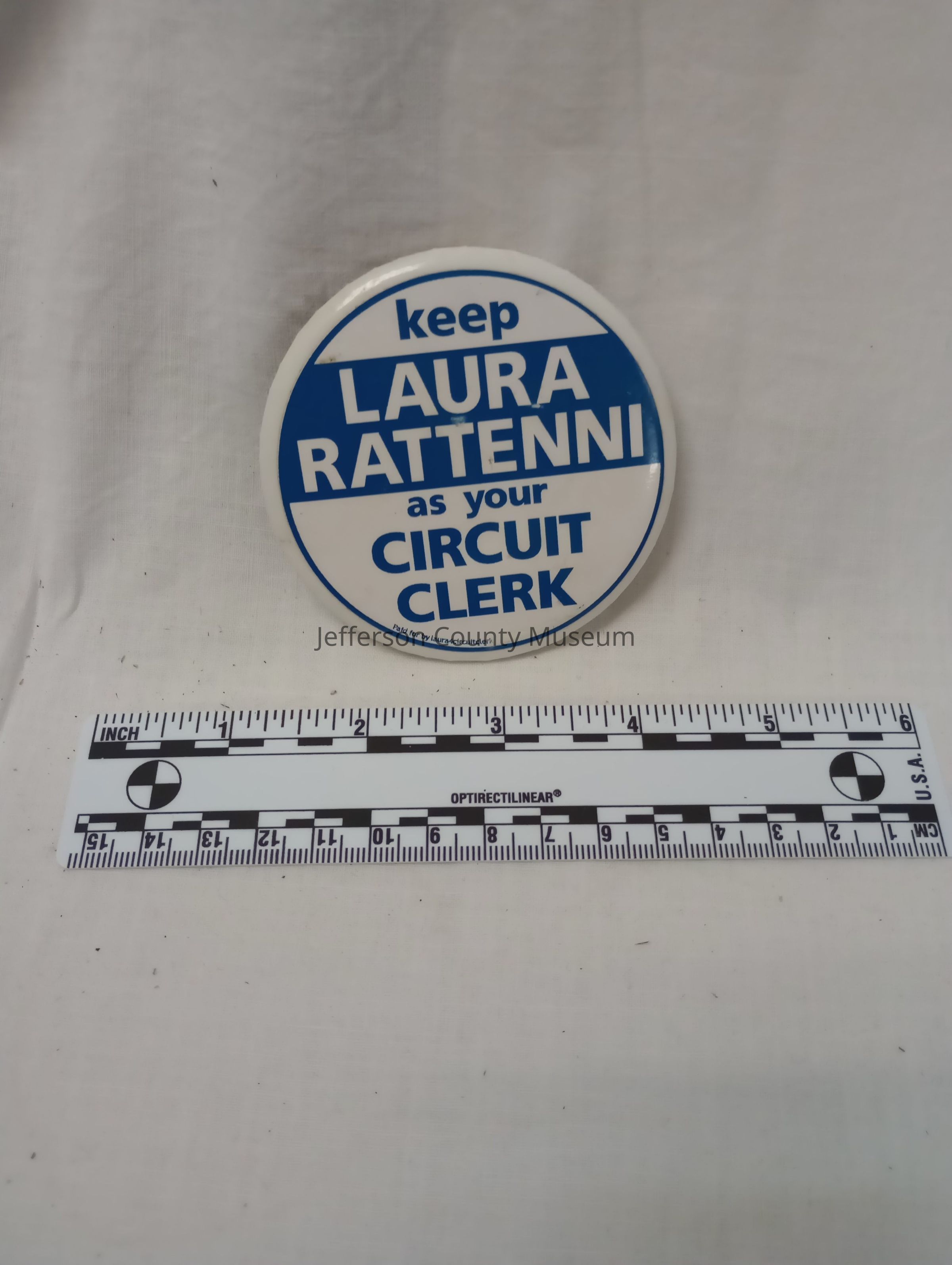 Circular white button with the blue text "keep LAURA RATTENNI as your CIRCUIT CLERK/Paid for by laura4circuitclerk."Context