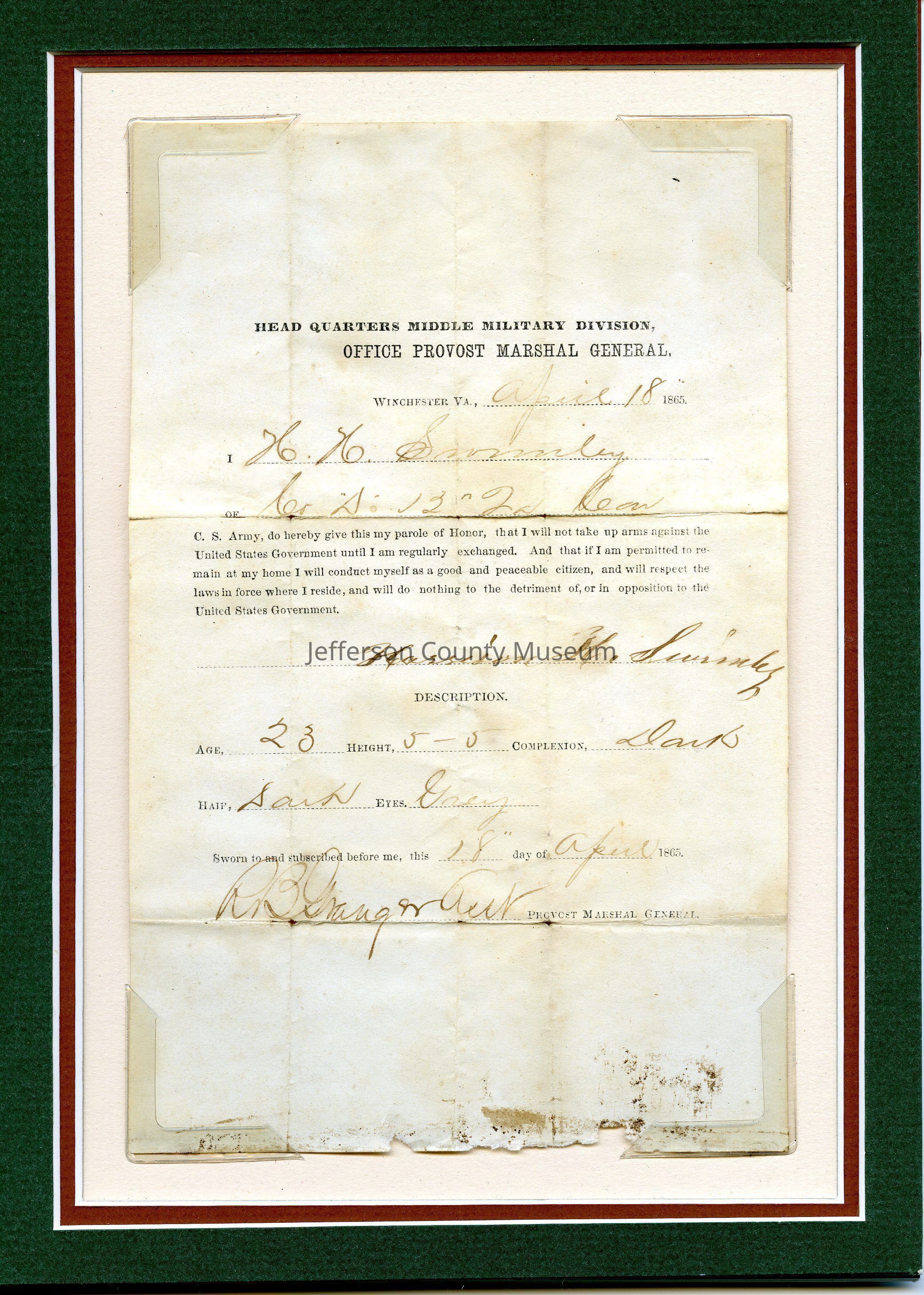 Parole of Honor. "HEAD QUARTERS MIDDLE MILITARY DIVISION, OFFICE OF PROVOST MARSHAL GENERAL". Winchester, VA, April 18, 1865. Parole is for Harrison H. Swimley.Acquisition