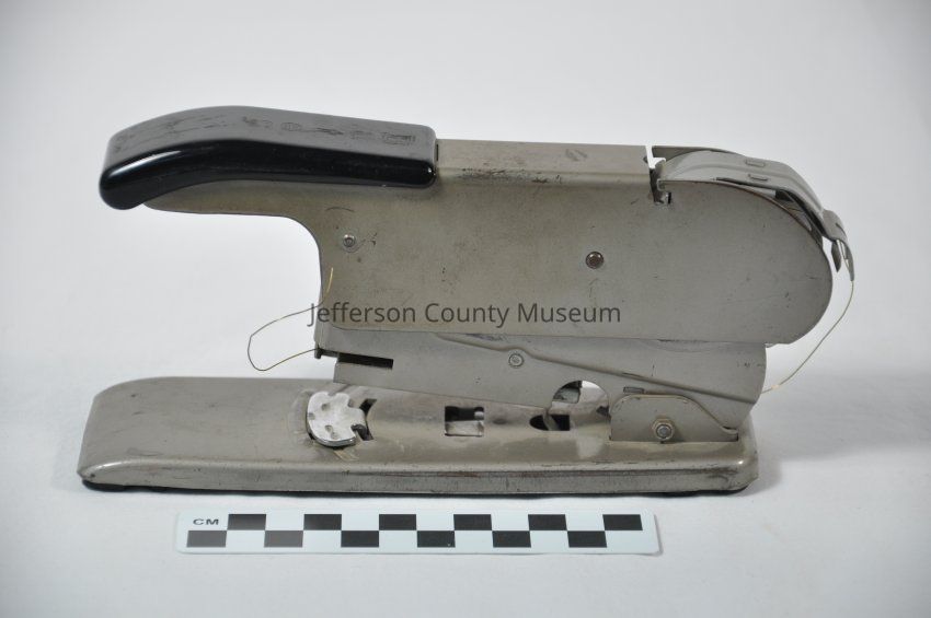 Model C Bates Stapler with wire spool for forming staples. Stamp on bottom appears to be "HCD". Used at the Jefferson County Courthouse.Acquisition