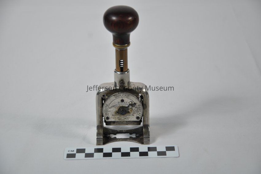Bates Automatic Numbering Machine with wooden knob handle used at the Jefferson County Courthouse.Acquisition