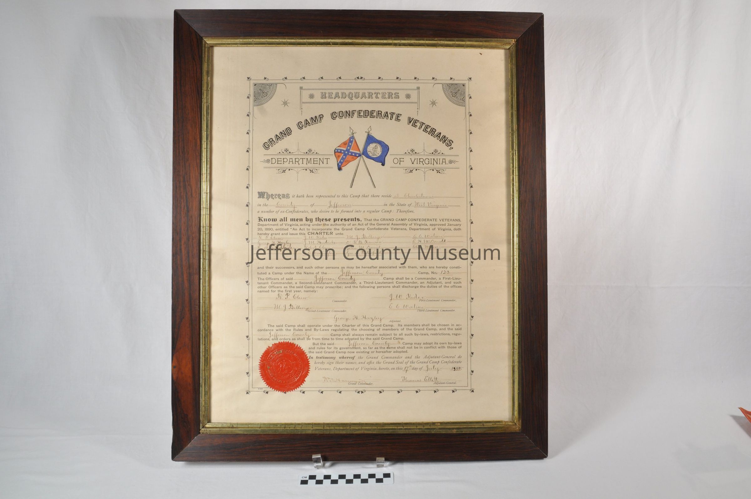Framed charter (no longer framed). At top "HEADQUARTERS GRAND CAMP CONFEDERATE VETERANS DEPARTMENT OF VIRGINIA". Crossed Confederate battle flag and Virginia flag. Issued to Jefferson County Camp Number 123 which included Roger Preston Chew, Commander. Dated July 17, 1905. Red seal at bottom left. Removed from frame on February 10, 2017.Acquisition