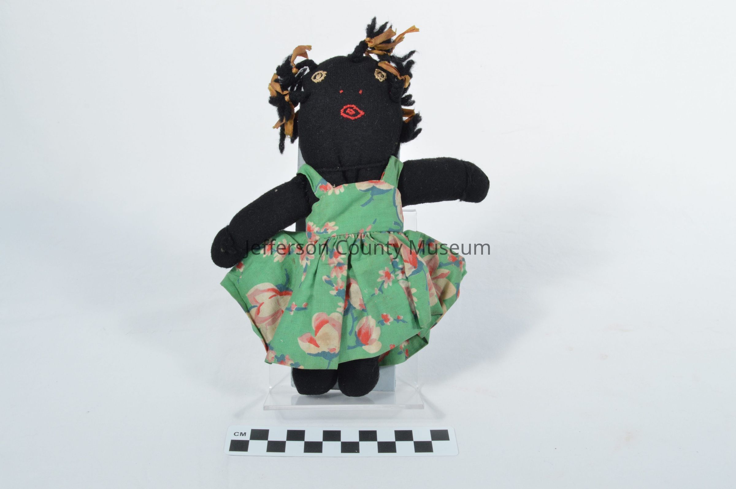 Handmade female African American sock doll (black doll) with floral design cotton frock (two shades of green, white, red, pink); embroidered facial features; hair in pigtails tied with gold ribbon; perhaps dating from the 1940s.Acquisition