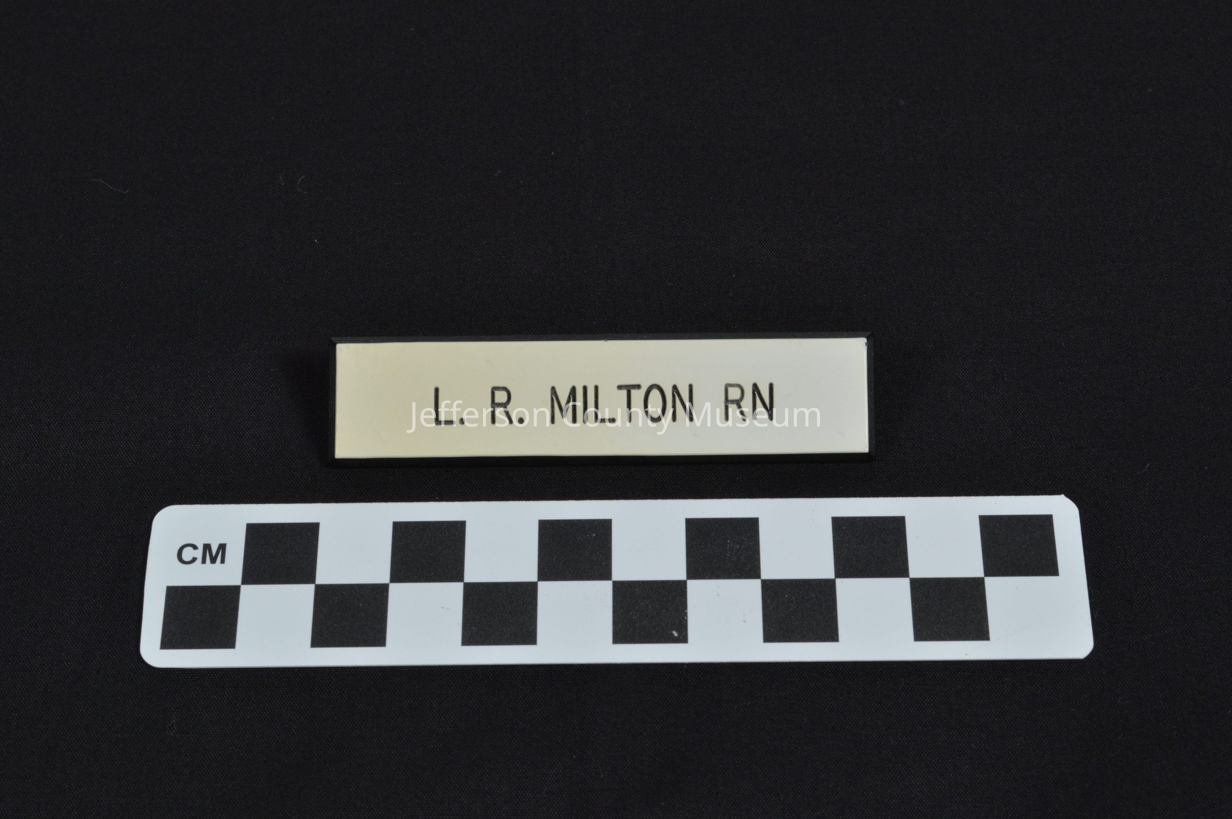 Bar pin, white plastic background with black lettering on black plastic surround. Name on pin: "L. R. MILTON RN". Pin closure affixed to back.Acquisition