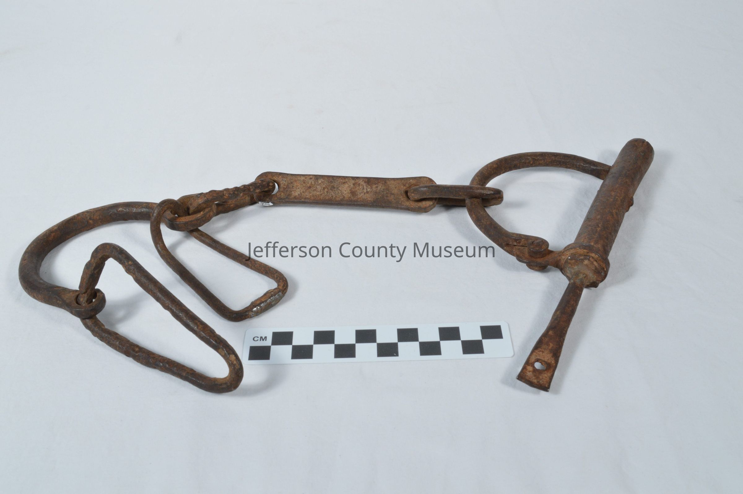 Wrought iron wrist shackle. One wrist piece is locked by a p-lock with worm to unlock. Lock also has a grease hole. The other wrist piece is closed with two triangular loops of iron that interlock for chaining to another enslaved person's shackle. A two-holed spacer with a chain link on either side separates the two wrist pieces. Used to prevent escape of enslaved people, for example, while moving them from place to place.Acquisition
