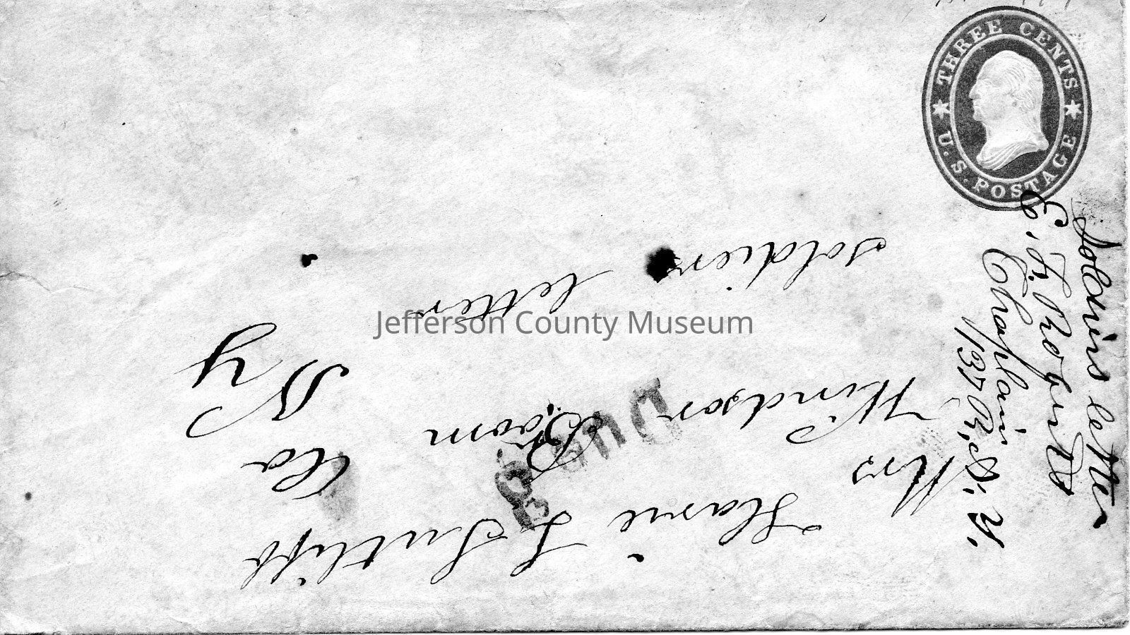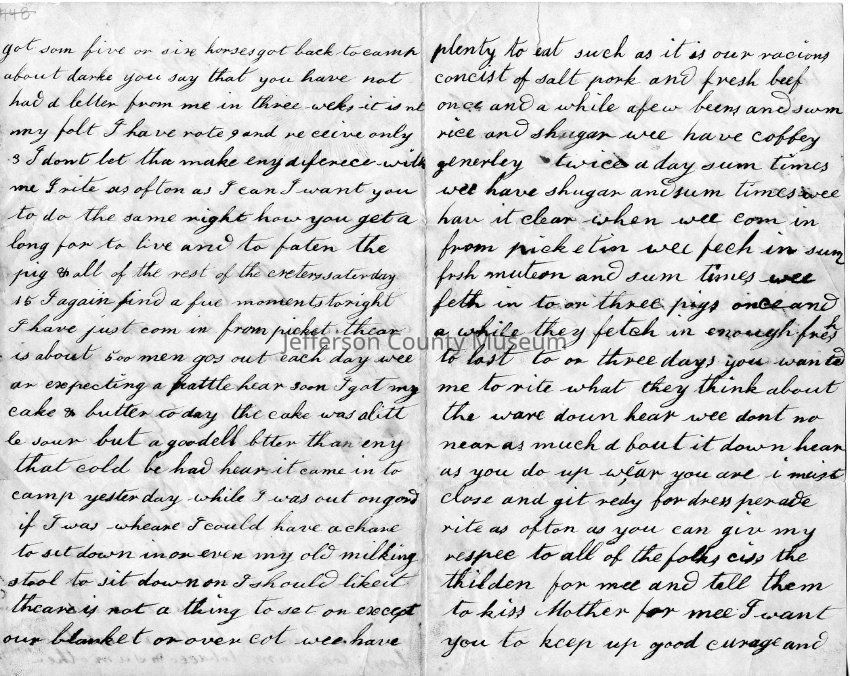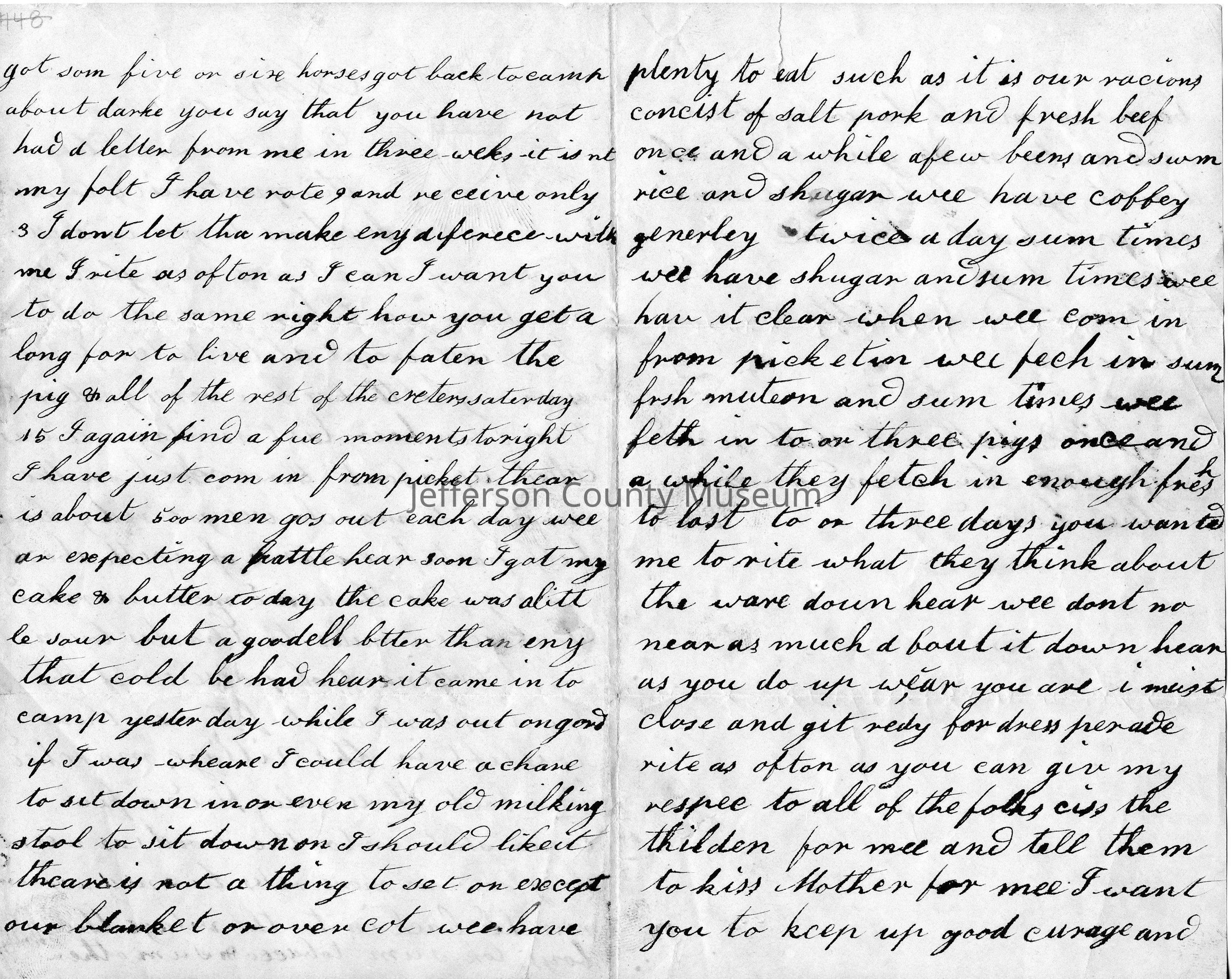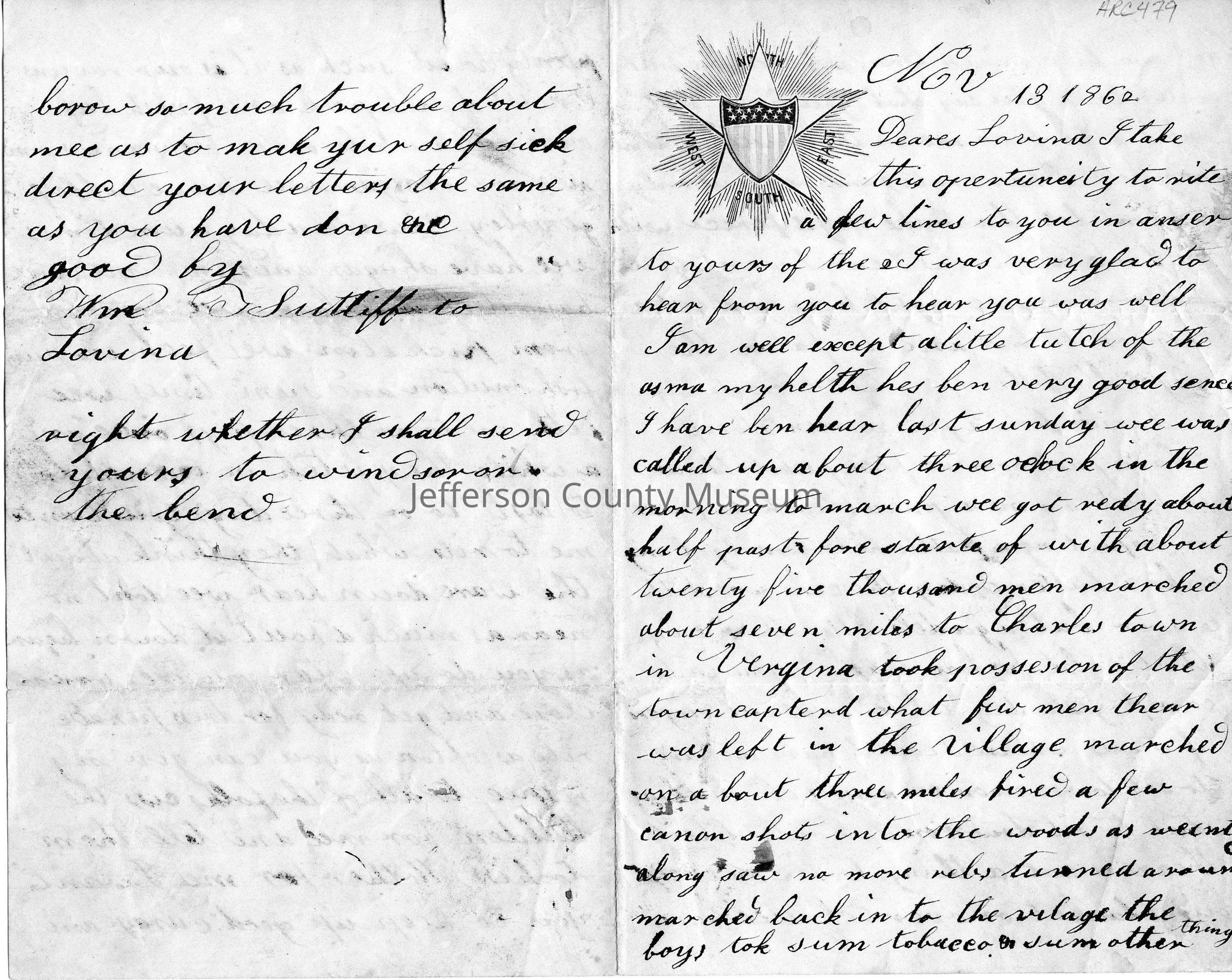 Four-page letter dated Nov. 13, 1862, from a Union soldier, Wm. Sutliff, to his wife "Deares Lovina." He describes marching to Charles Town with 25,000 men, capturing a few soldiers and firing a few cannon shots. Also has envelope addressed to "Mrs. Marie L. Sutliff, Windsor Boom, Co., NY". He lived in Windsor, Broom County, New York.