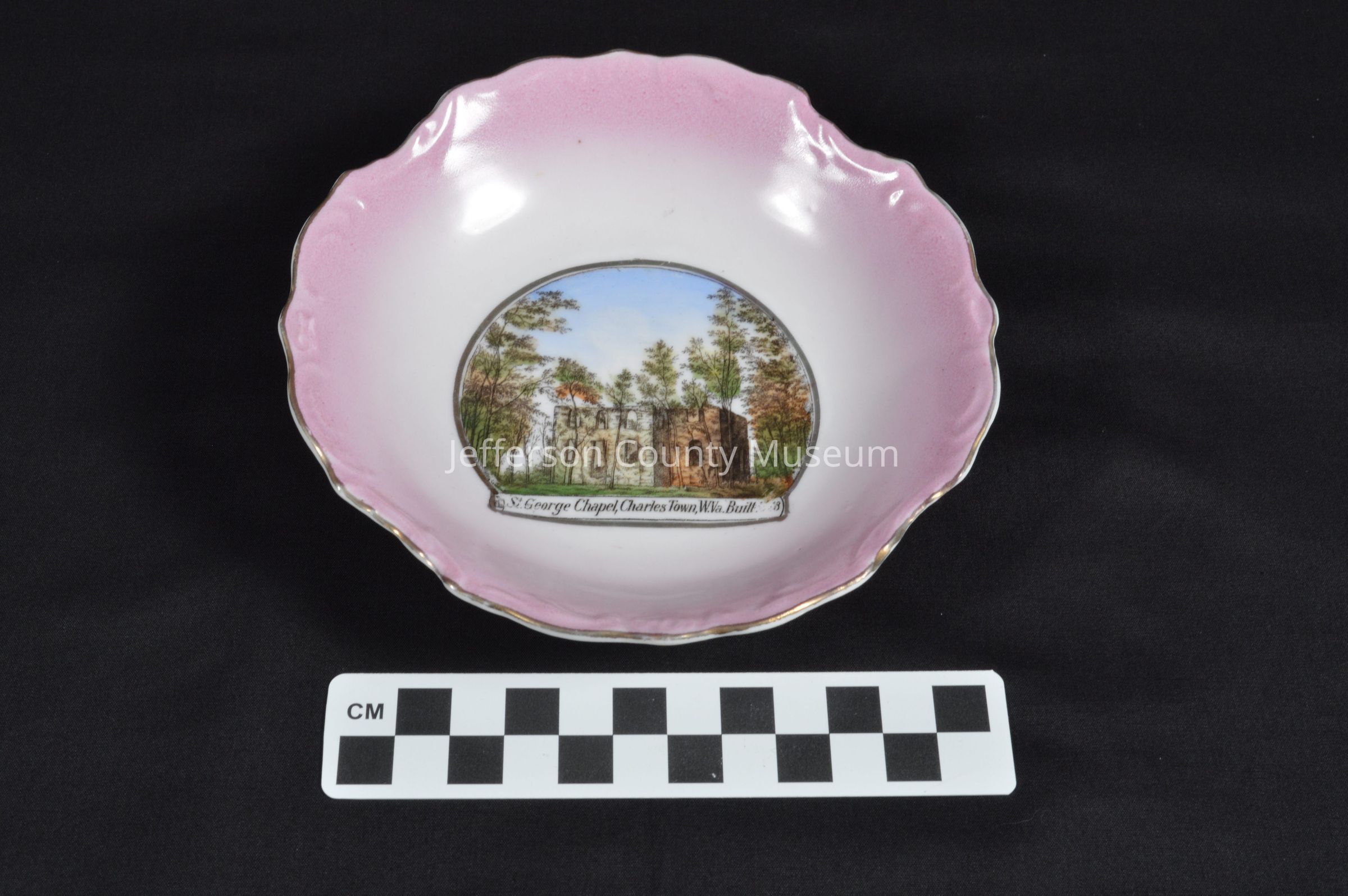 Small china bowl with pink rim; in center of bowl is picture of St. George's Chapel in circle; printed below picture: "St. George Chapel, Charles Town, W.Va. Built ----- [date is worn off]". On reverse is red circle with the following words in red inside the circle: "CHARLES W. BROWN CHARLES TOWN, W. V." These bowls and other similar decorative items were sold by Charles W. Brown in his jewelry shop on West Washington Street in Charles Town from the late 1800s to the early 1900s. The store was located at 130 West Washington Street, near the corner of Charles Street and West Washington Street.Acquisition