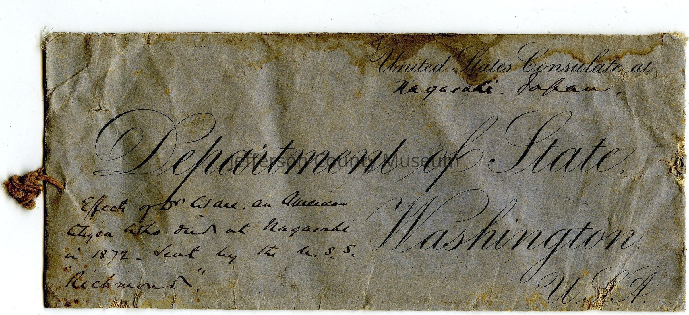 (2) Gray paper envelope lined with cloth. Small piece of string attached to left side. Printed in script "United States Consulate at" (handwritten) "Nagasaki, Japan" (printed script) "Department of State Washington U.S.A." Written in script "Effects of Dr. Ware. an American Citizen who died at Nagasaki in 1872 - Sent by the U.S.S. 'Richmond'".