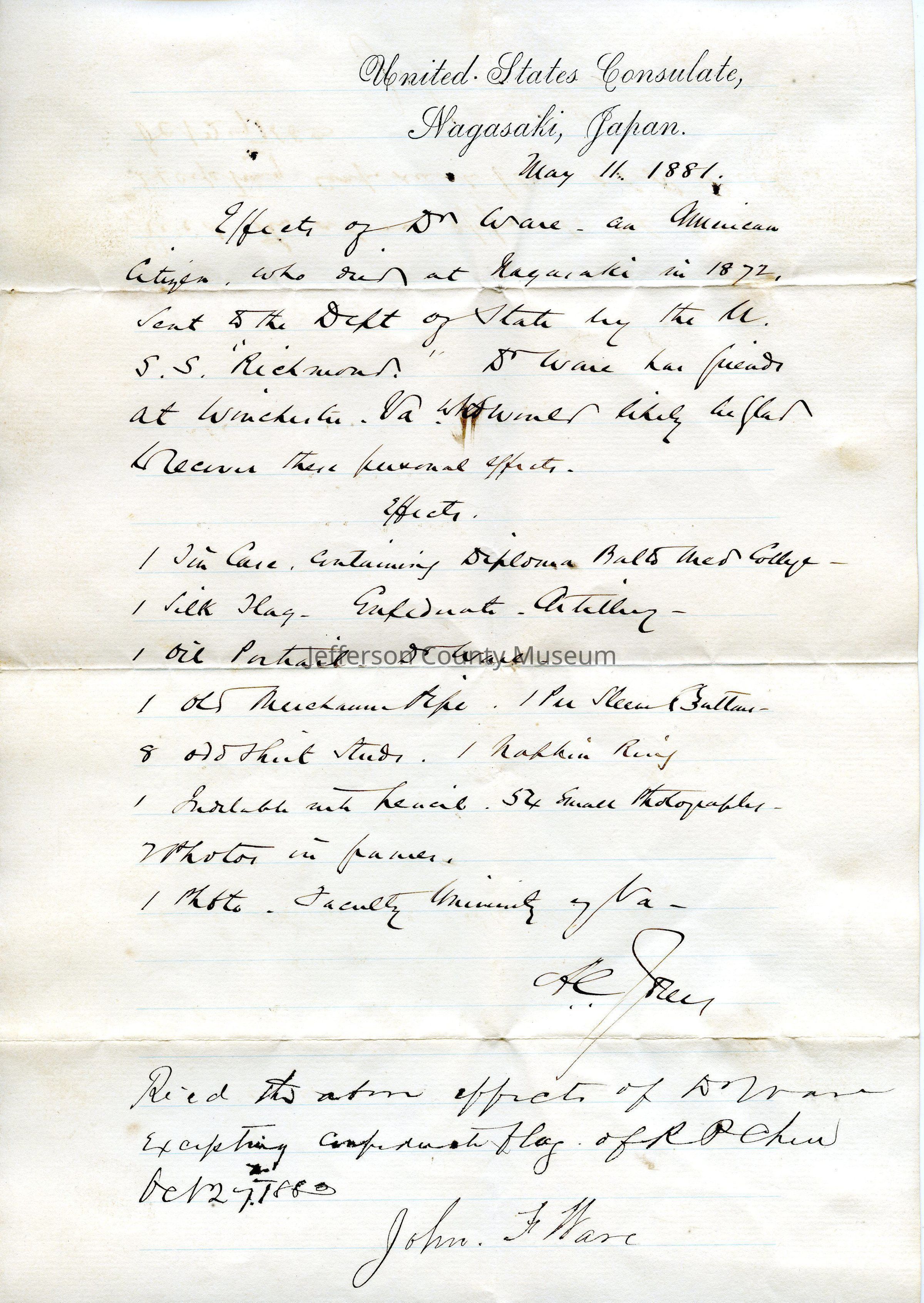 (1) A list of personal effects of Dr. Nimrod Ware, including "1 Silk Flag - Confederate Artillery" - the Chew flag. Printed in script at top "United States Consulate, Nagasaki, Japan." Dated May 11, 1881. Signed as received, except Confederate flag (which went to Roger P. Chew , by John F. Ware, October 27, 1883.