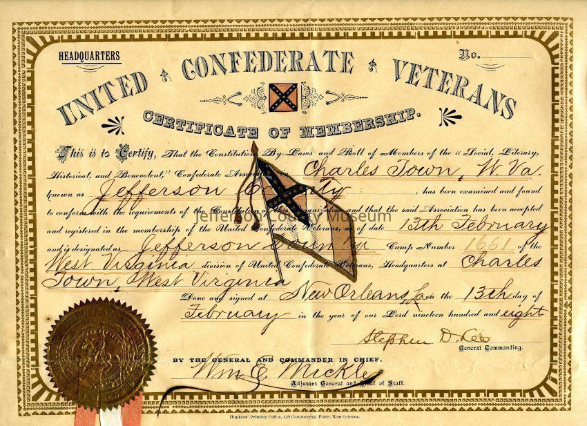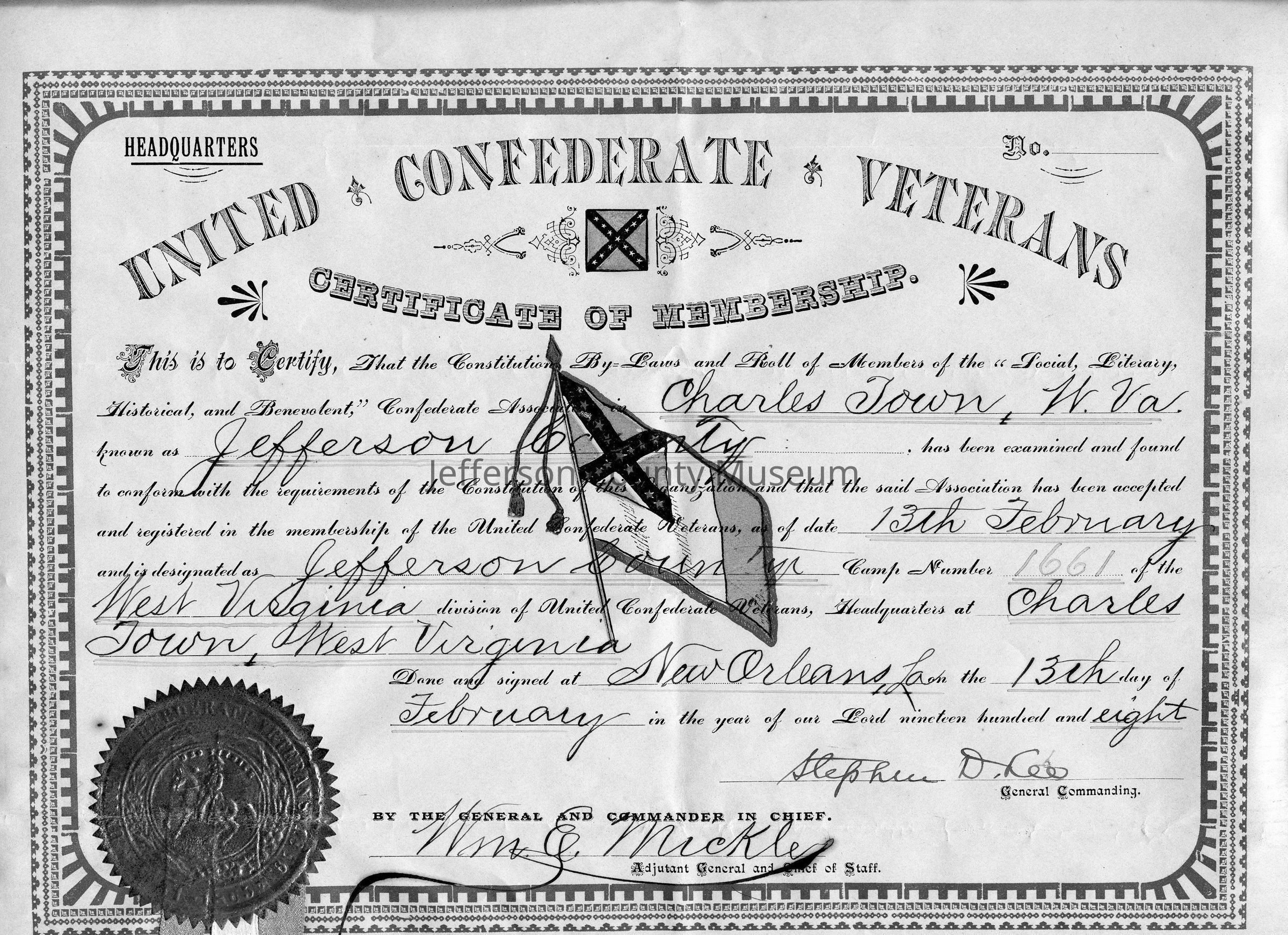 United Confederate Veterans certificate of membership for Charles Town chapter. Dated February 13, 1908, and signed by William E. Mickle. Gold seal in bottom left corner with 2 red ribbons and white ribbon between.Acquisition