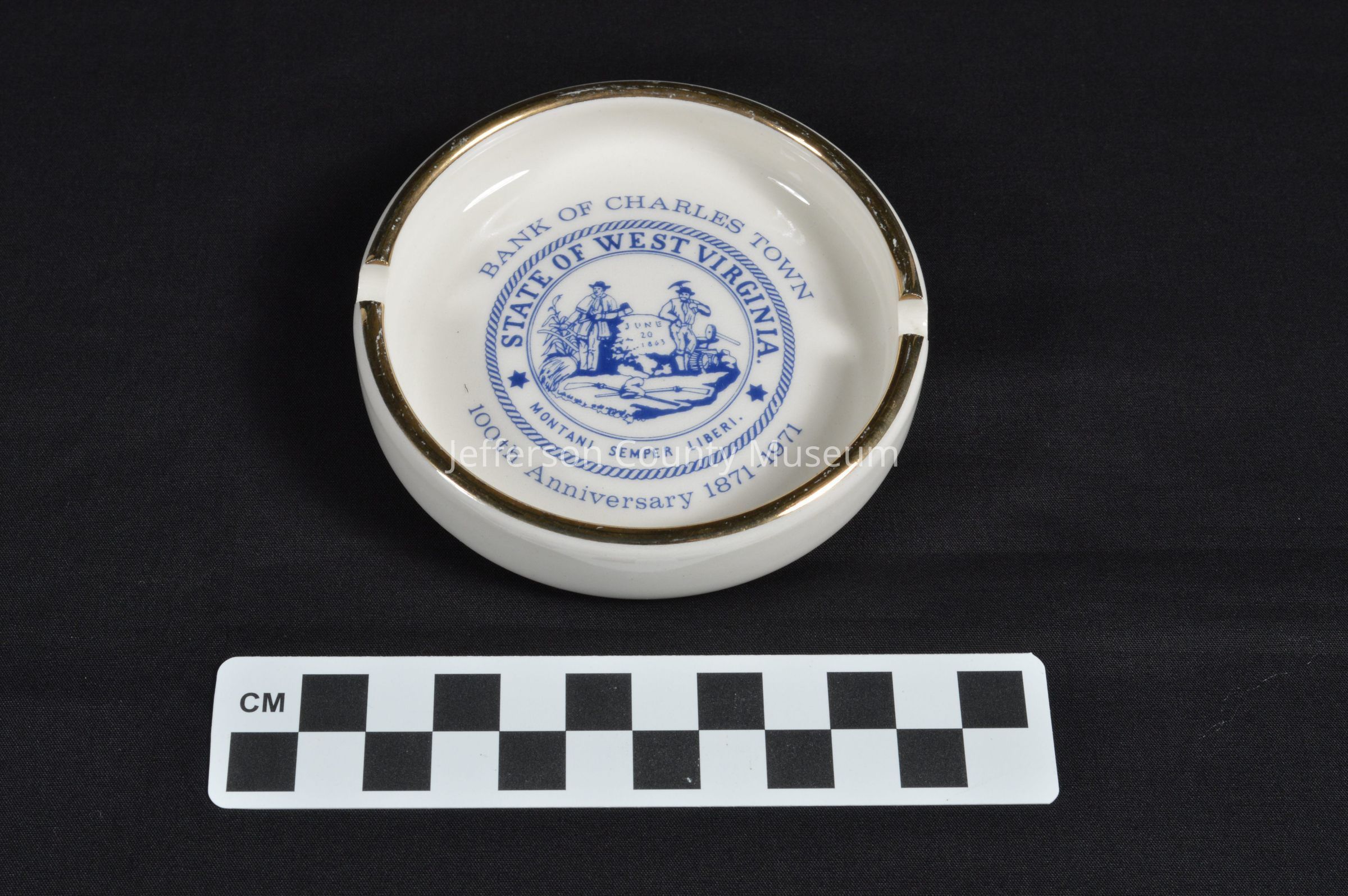 White ceramic ashtray with gilt rim; imprinted in blue in center of ashtray is West Virginia state seal, imprinted above: "BANK OF CHARLES TOWN", imprinted below: "100th Anniversary 1871-1971".Acquisition