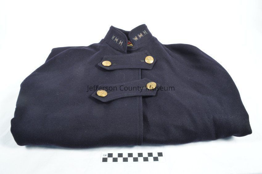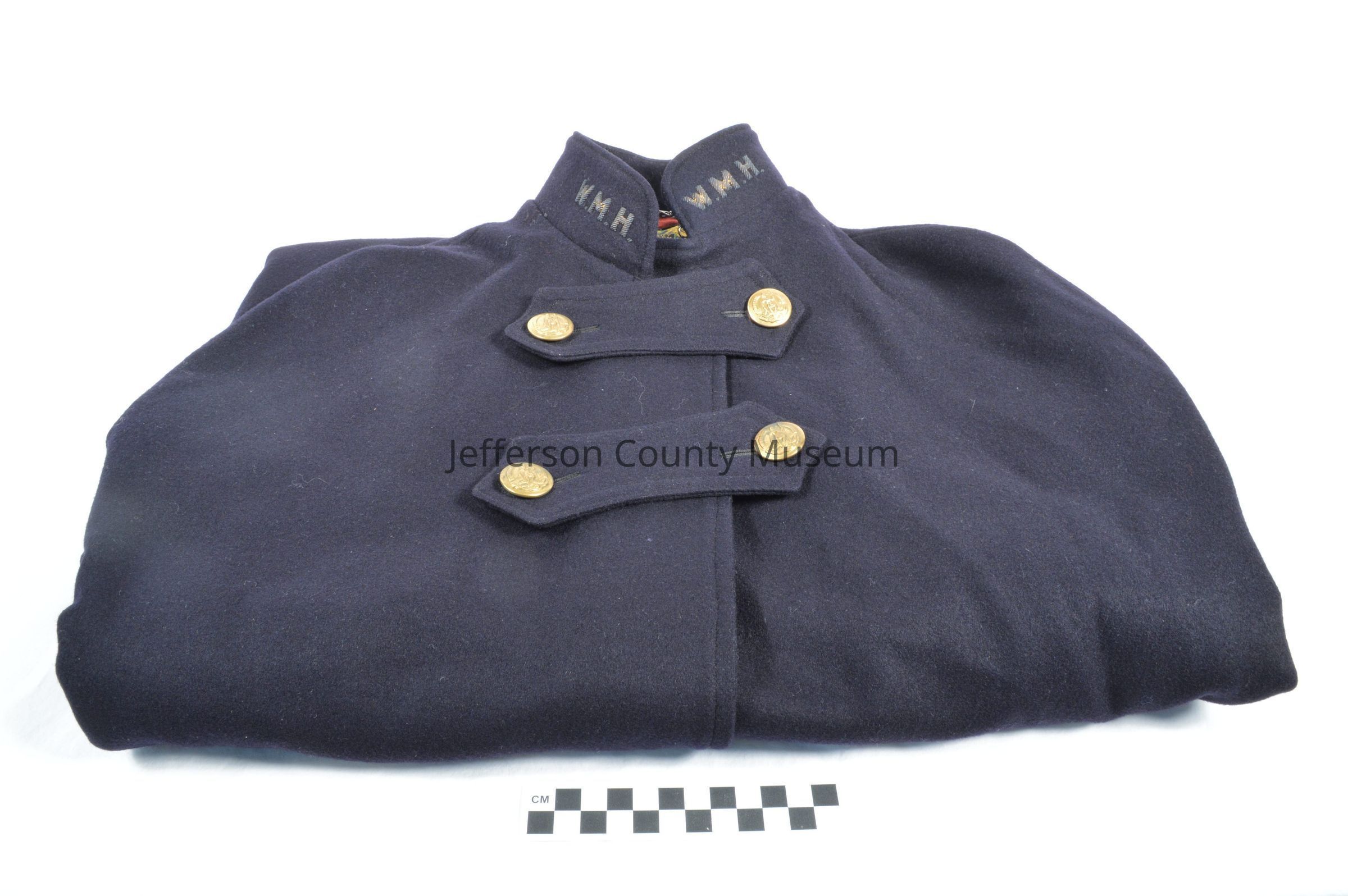 Navy blue wool cape with red wool lining. Two frog-style closures with brass buttons embossed with state seal of Virginia. "W.M.H." [for Winchester Memorial Hospital] on either side of mandarin-style collar. Rectangular black label with gold lions is sewn in center back of lining, just below collar: "QUALITY UNIFORM Tailored by STEIN UNIFORM CO. BALTIMORE"; silver chain (for hanging cape) attached in center of back, where lining is sewn to collar. Small pocket sewn in left side of facing and embroidered in gold: "L.K.R." (for Lucy Katherine Rosenberger).Acquisition