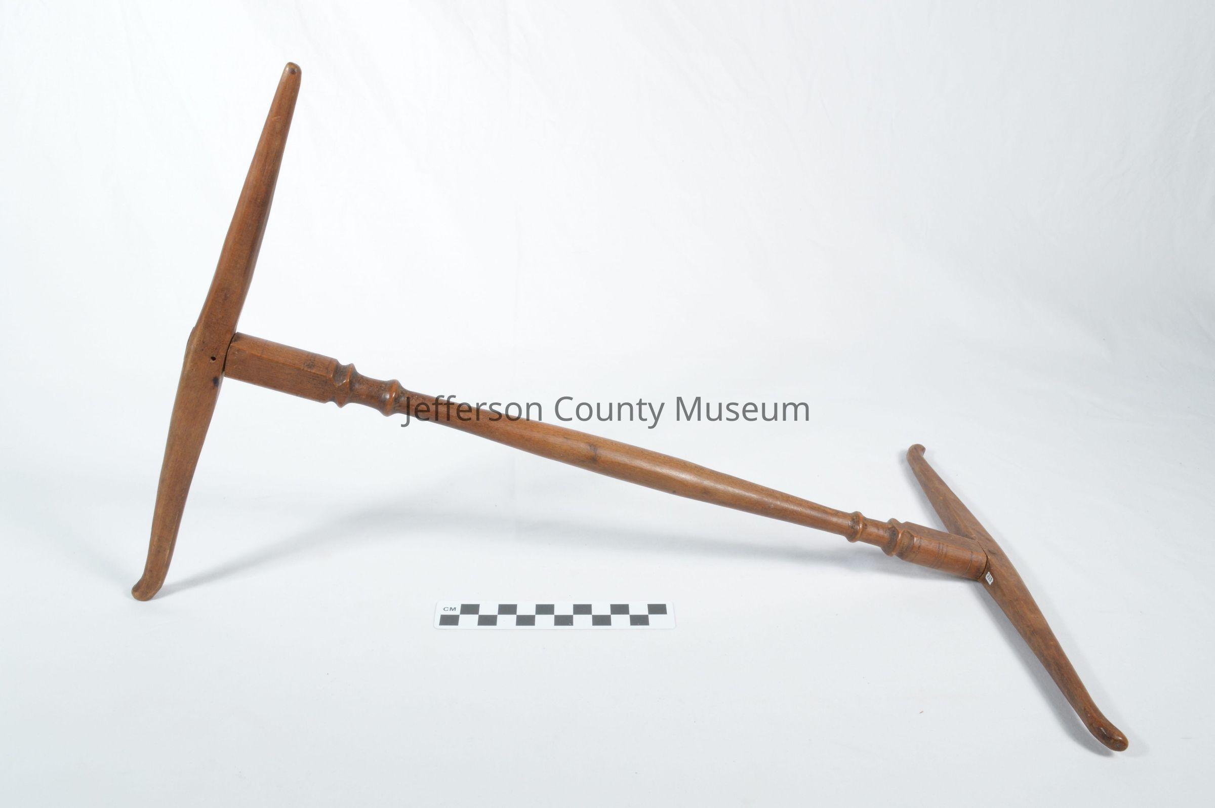 Niddy-noddy, used when removing yard from spinning wheel to wind yarn into a skein. Put together with mortise-and-tenon joints and small wooden pegs. Lathe work and incising on each end of the connecting arm (center piece).Acquisition