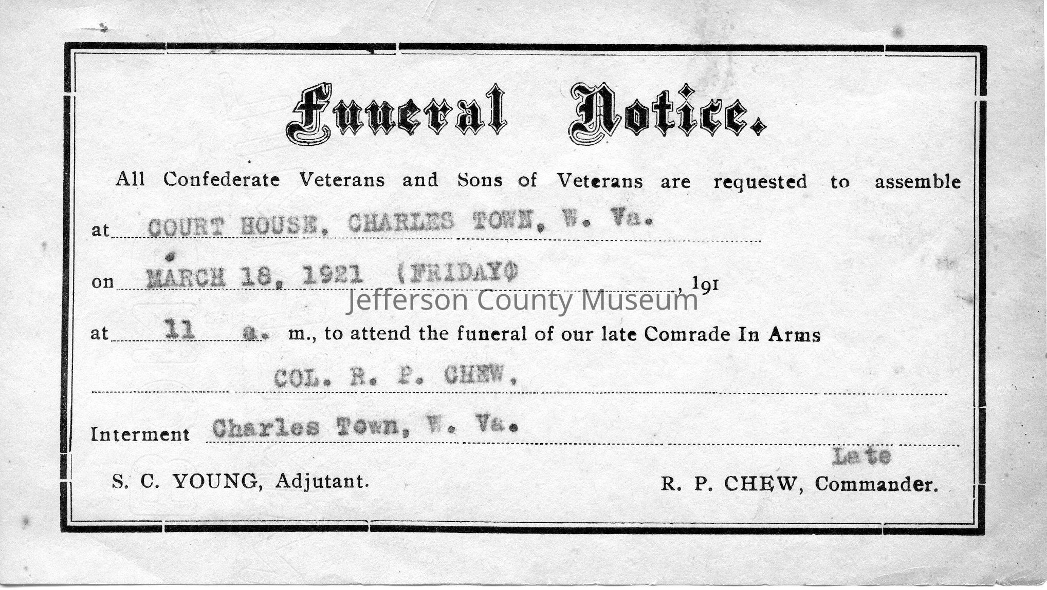 Printed at top "Funeral Notice". Typed on form "COURT HOUSE CHARLES TOWN, W.Va. MARCH 18, 1921 (FRIDAY) 11 a.m. COL. R. P. CHEW, Charles Town, W. Va. Late". Thin black border in 2 lines.Acquisition