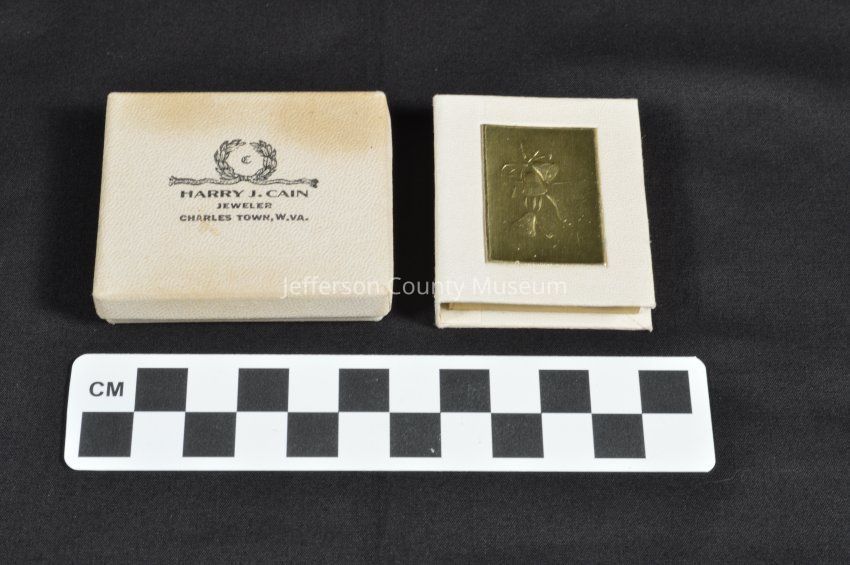 Small, white jewelers' box from Harry J. Cain's jewelry store in Charles Town, WV. "C" inside wreath, with ribbons below wreath; imprinted below ribbons: "HARRY J. CAIN JEWELER CHARLES TOWN, W. VA." Inside this box is smaller box that held a wedding ring (but ring no longer is present). Gold foil is attached to lid of smaller box, gold foil is embossed with three bells and ribbons. Year range above is approximate.Acquisition