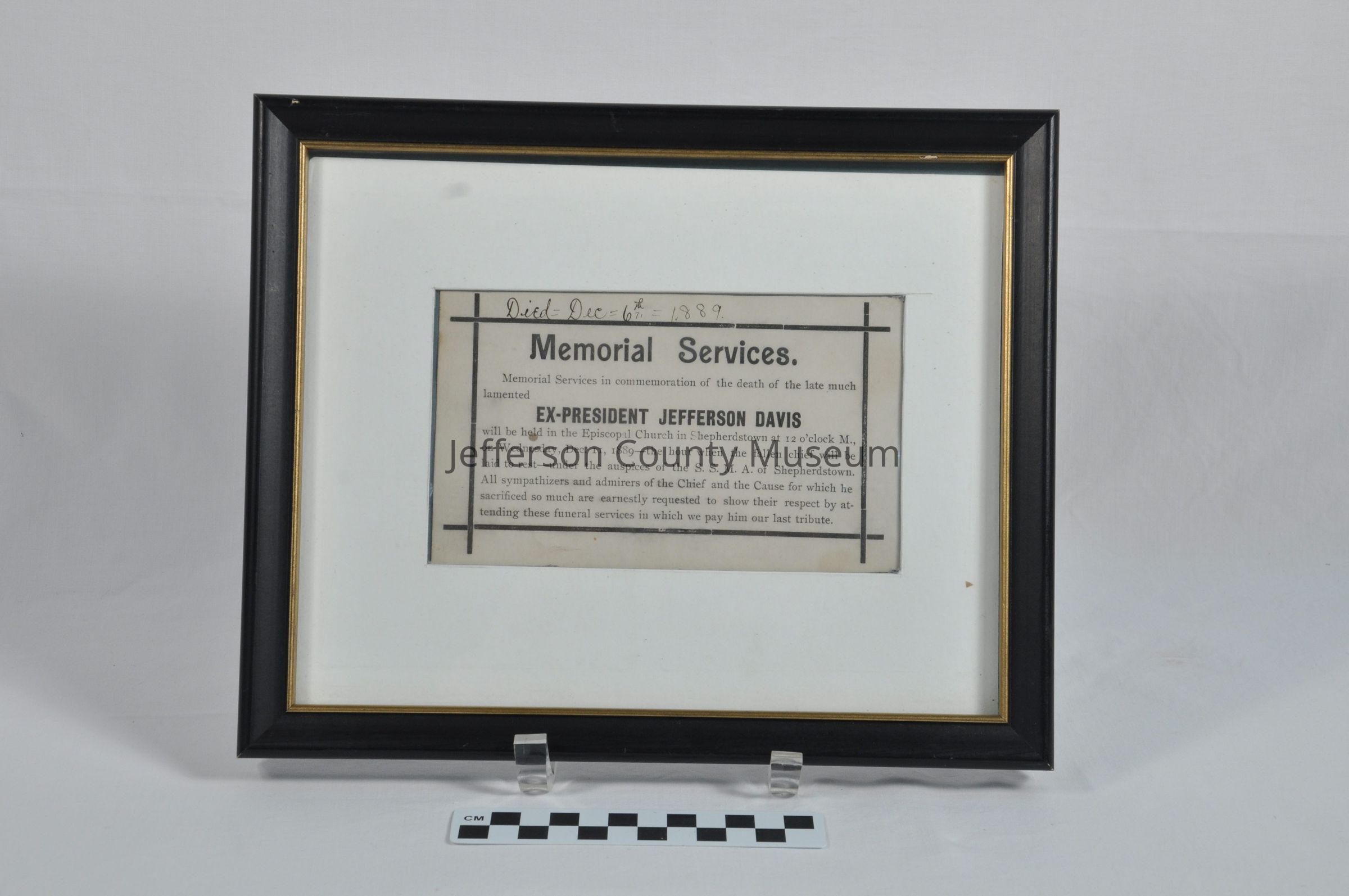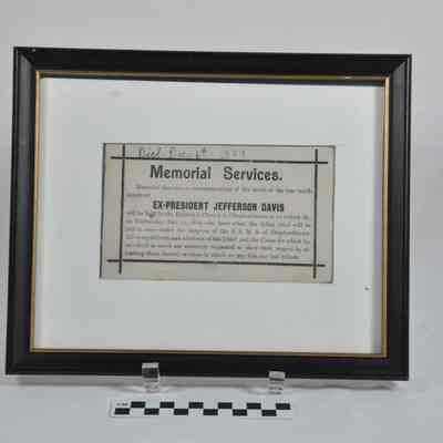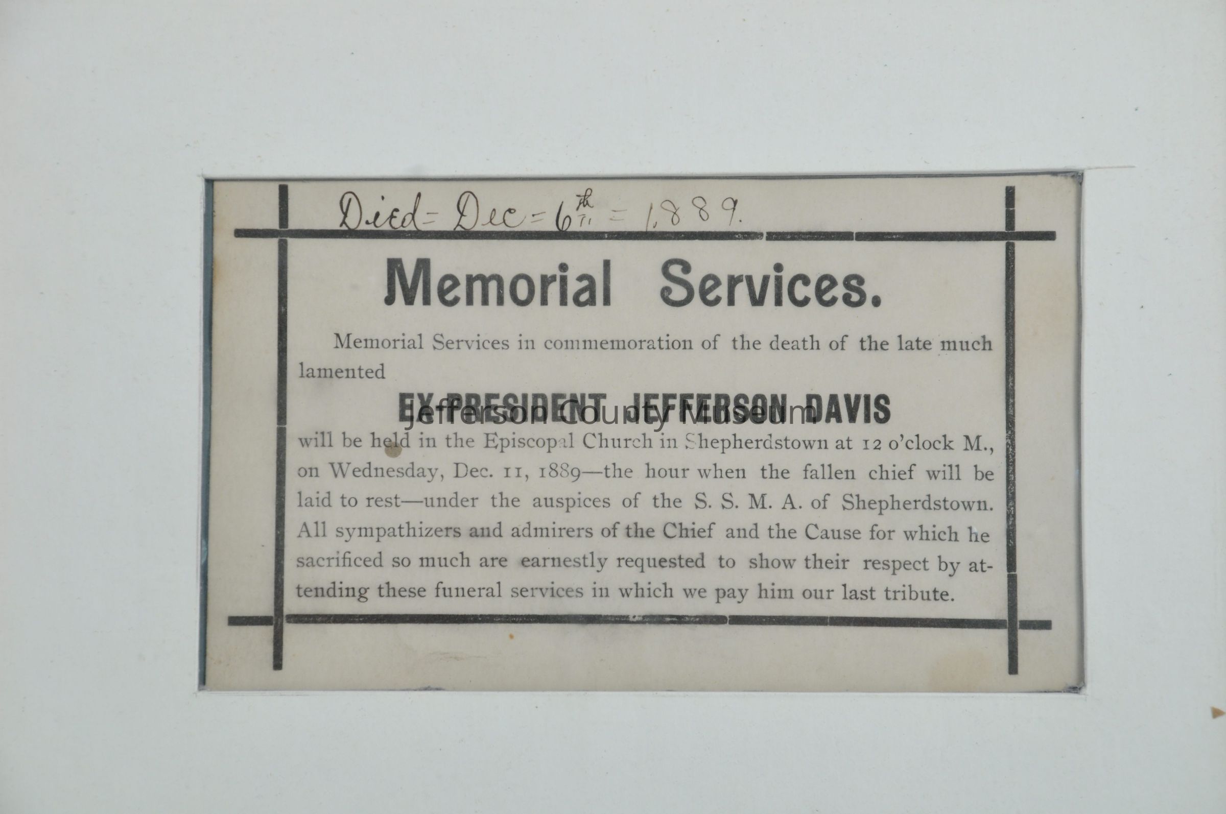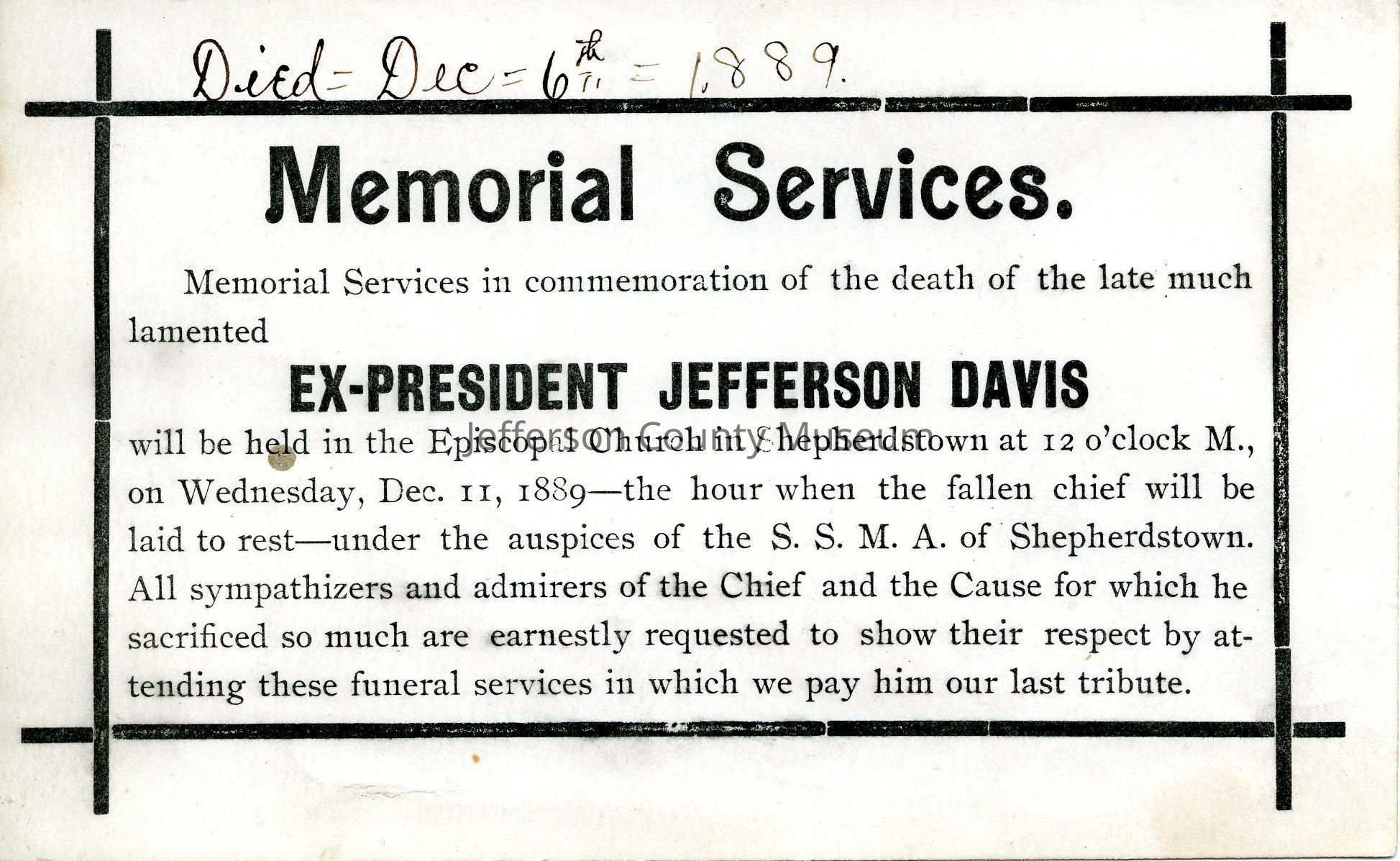 Announcement about "Memorial Services in commemoration of the death of the late much lamented EX-PRESIDENT JEFFERSON DAVIS". Services were held at the Episcopal Church in Shepherdstown on Wednesday, Dec. 11, 1889. Handwritten in ink at top "Died=Dec=6th=1889". Illegible ink scribbles on reverse. Framed reproduction is hanging on West Wall of Museum.Acquisition