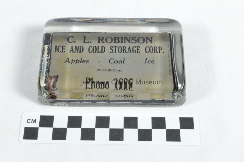 Rectangular glass paperweight with paper insert in center: "C. L. ROBINSON ICE AND COLD STORAGE CORP. Apples - Coal - Ice Phone 3886". Printed along one side of insert: "BANKERS ADV. CO., IOWA CITY, IOWA". Some type of sealant used to seal paper in center of glass.Acquisition