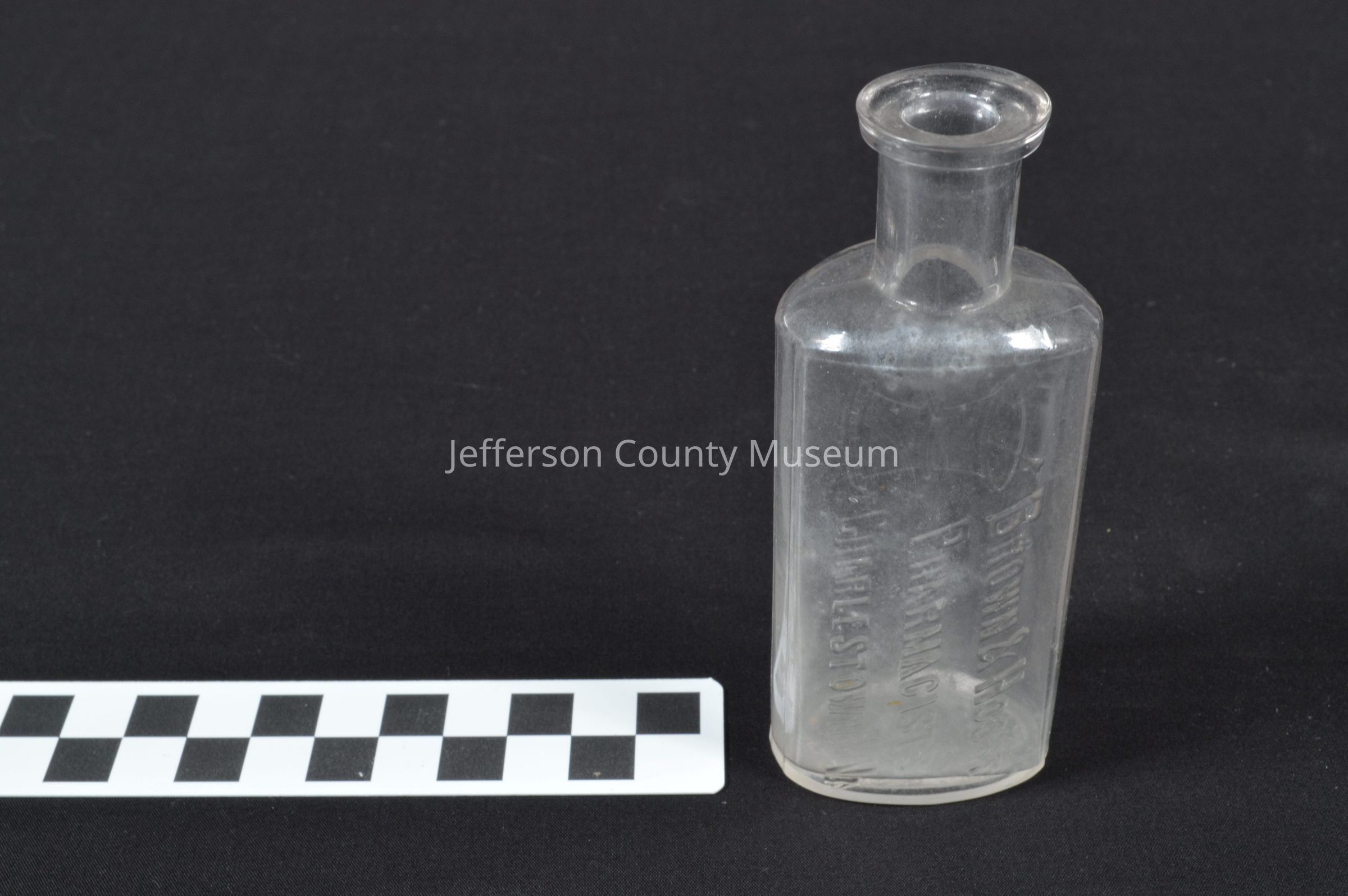Clear glass medicine bottle, probably had a cork stopper, but cork is missing. One side is embossed with a mortar and pestle near the shoulder of the bottle, then followed by: "BROWN & HOOFF PHARMACISTS CHARLESTOWN, W. VA" (there does not appear to be a period after the "A"). Embossed on bottom of bottle: "2 PAT'D 6/25/89 C.L.C. CO."Acquisition