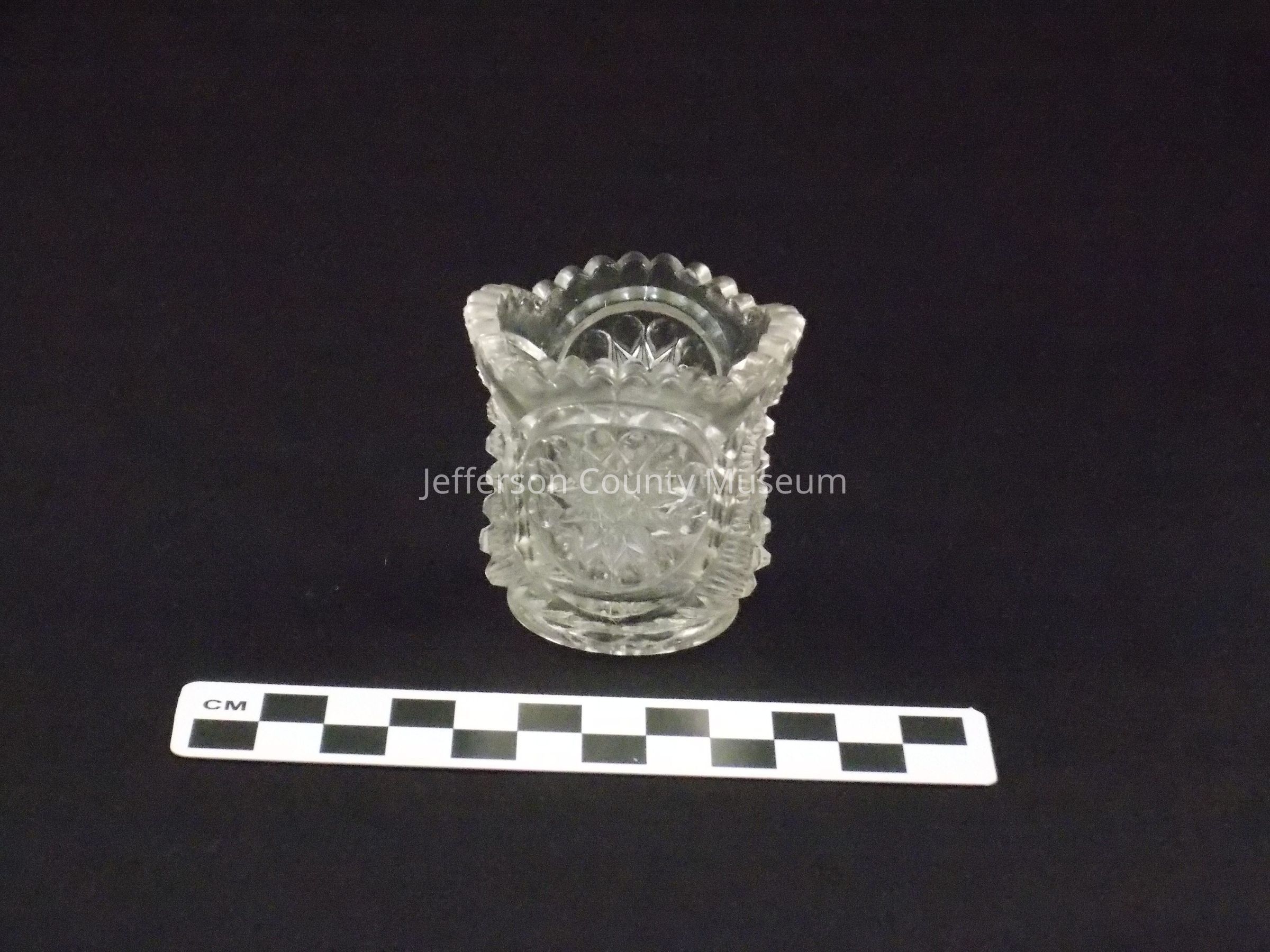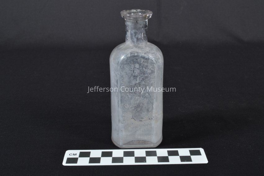 Clear glass medicine bottle, probably had a cork stopper, but cork is missing. Embossed on bottle in an arch shape: "AISQUITH & CO. PHARMACISTS". This is followed by an embossed shield shape with an "A" inside. Embossed below shield: "COURT HOUSE SQUARE CHARLESTOWN W. VA.". There are embossed letters and symbols on the bottom of the bottle, but they are difficult to read.Acquisition