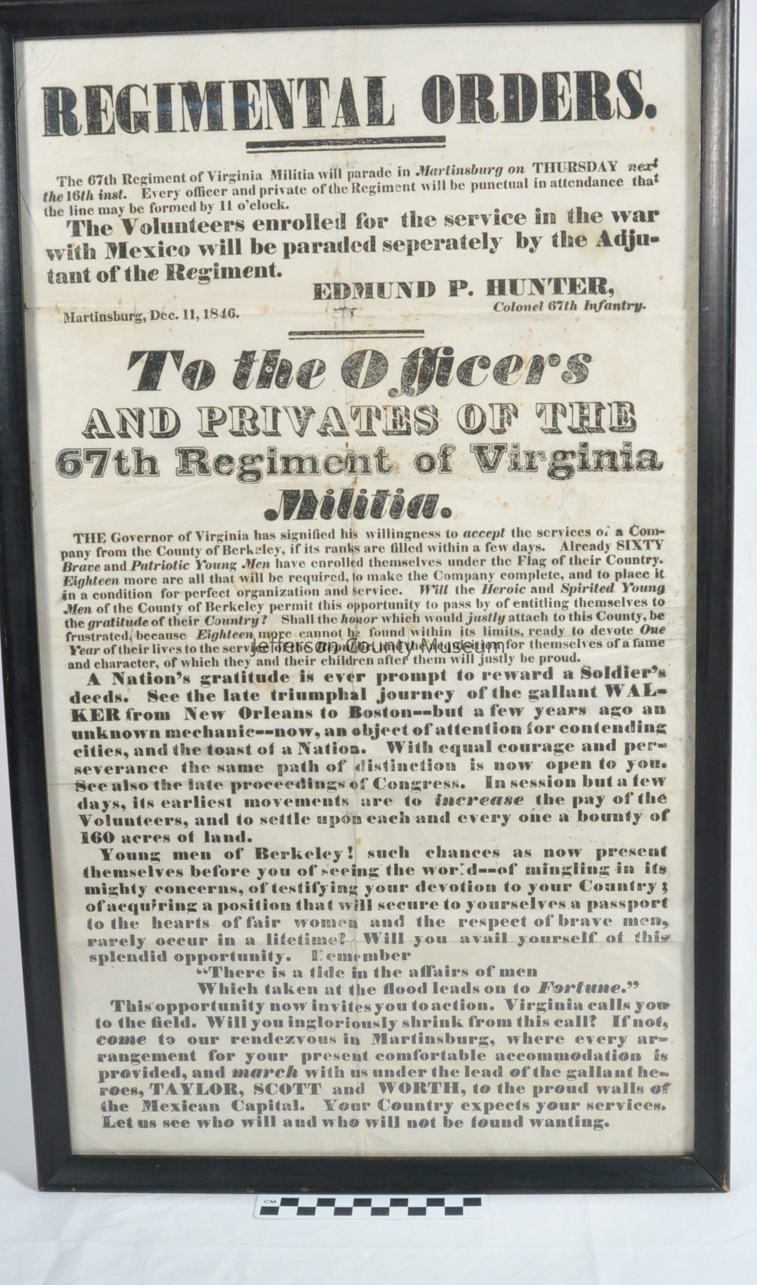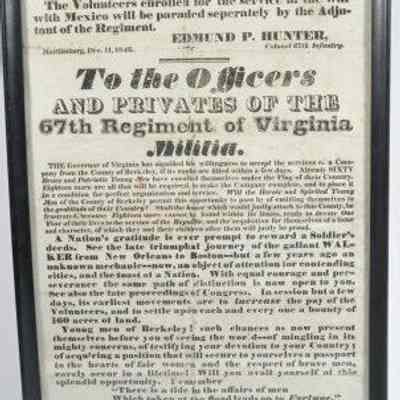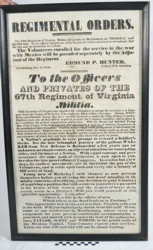 Regimental orders "To the Officers and Privates of the 67th Regiment of Virginia Militia" to assemble for a parade in Martinsburg. Volunteers for Mexican War were to parade separately. Issued by Colonel Edmund P. Hunter. Dated December 11, 1846. Purportedly the only one in existence.