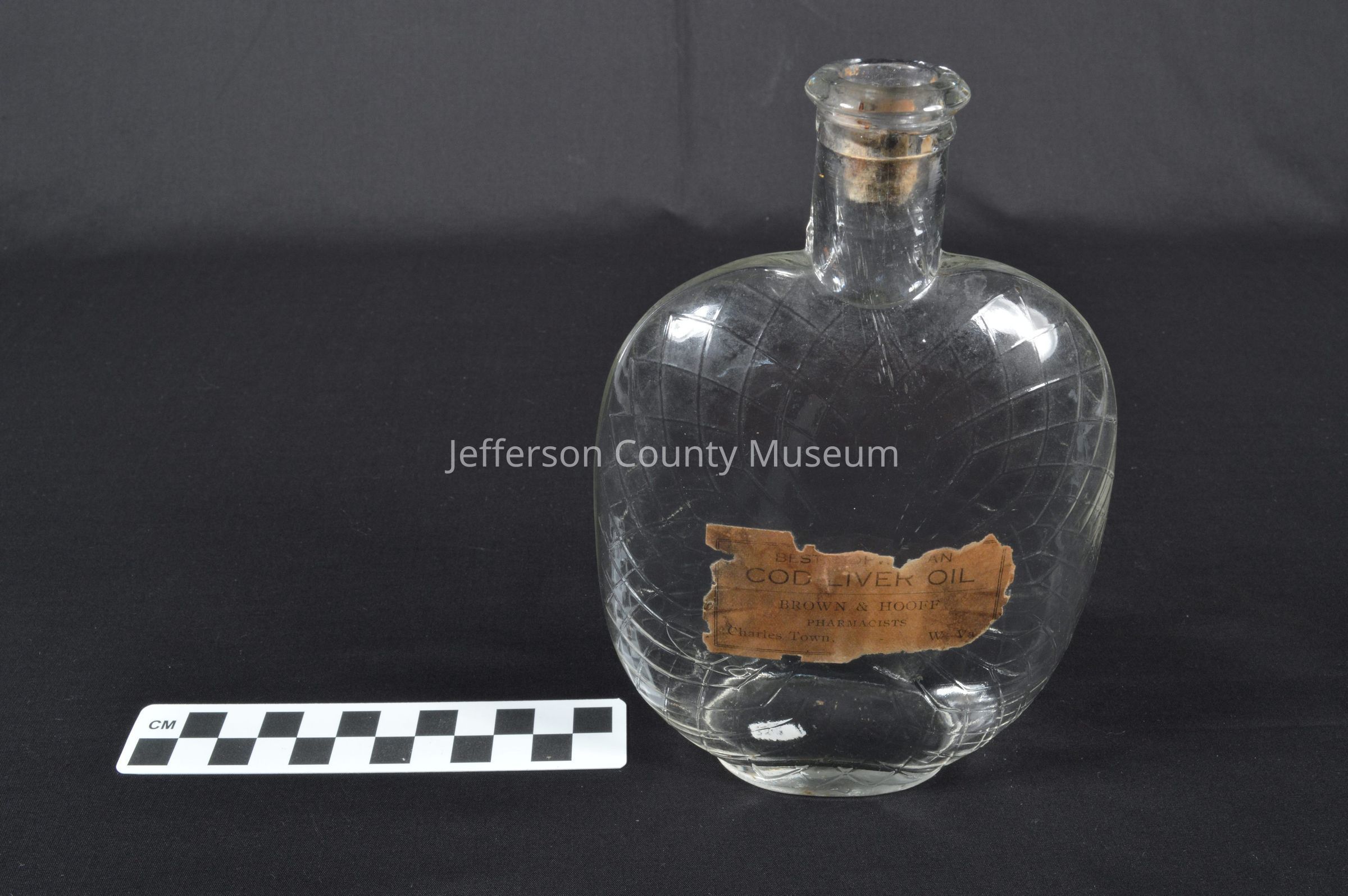 Clear glass bottle with embossed sunburst design on front and back. Cork stopper is broken down in neck of bottle. Partial paper label: "COD LIVER OIL BROWN & HOOFF PHARMACISTS Charles Town, W. Va.".Acquisition