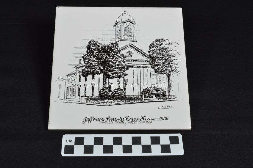 White tile with picture of Jefferson County Court House in black. Printed in black below illustration: "R. JONES D. BENEDICT". Printed in black script: "Jefferson County Court House - 1836"; below that, printed in black: "CHARLES TOWN, WEST VIRGINIA". Incised on reverse: "Made in England" and "H & R Johnson Tiles Ltd". Illustration on tile was from a woodcut. Tile was one of a set of three, the other two illustrations were John Brown's Fort and Thomas Shepherd Mill. Jones and Benedict were art professors at Shepherd College.Acquisition