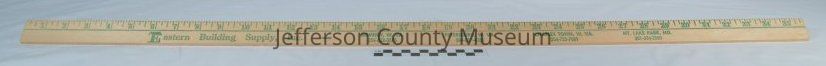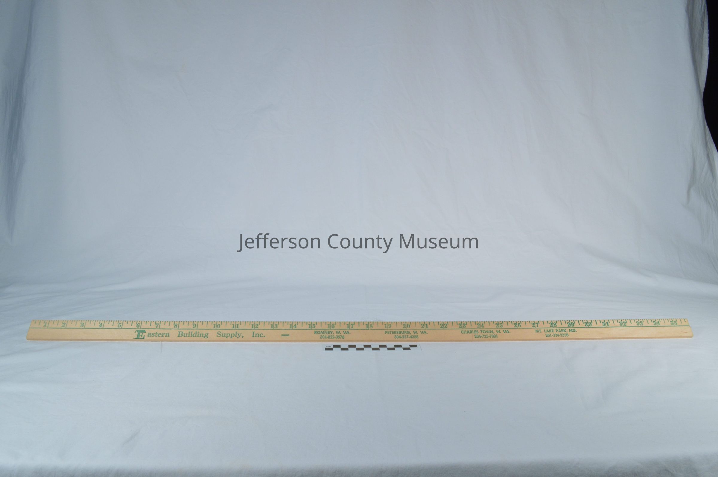 Yardstick with the words Eastern Building Supply, Inc. and Charles Town, W. VA. 304-725-7091 plus 3 other locations stamped in green ink underneath the measuring portion in inches on the front side. EVERYTHING FOR THE BUILDER AND DO-IT-YOURSELFER stamped in green ink underneath the measuring portion in centimeters on the back side. Used for advertising and as complimentary gifts for customers. Eastern Building Supply, Inc. was located at 669 Willow Spring Drive, Charles Town, and operated in the 1970s to early 1990s.Acquisition
