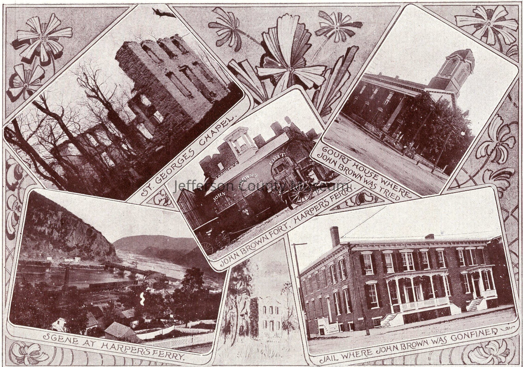 Collage of St. George's Chapel; Scene at Harpers Ferry; John Brown fort, Harpers Ferry; Court House Where John Brown was Tried; Jail where John Brown was confined. (No.18)