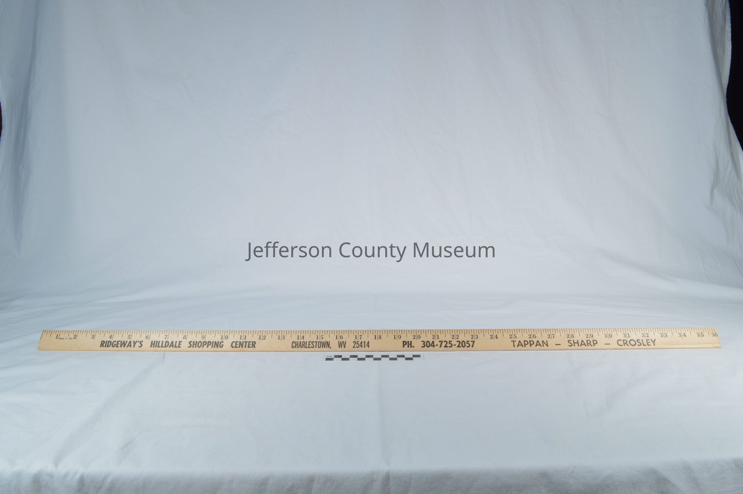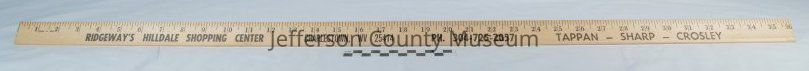 Yardstick with the words RIDGEWAY'S HILLDALE SHOPPING CENTER CHARLESTOWN, WV 25414 PH. 304-725-2057 TAPPAN-SHARP-CROSLEY underneath the measurement portion in inches on both sides. Used for advertising and as complimentary gifts for customers. Tim Ridgeway's store operated from the 1980s to the 1990s.Acquisition