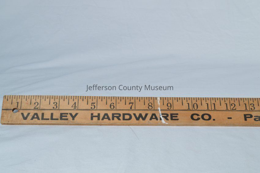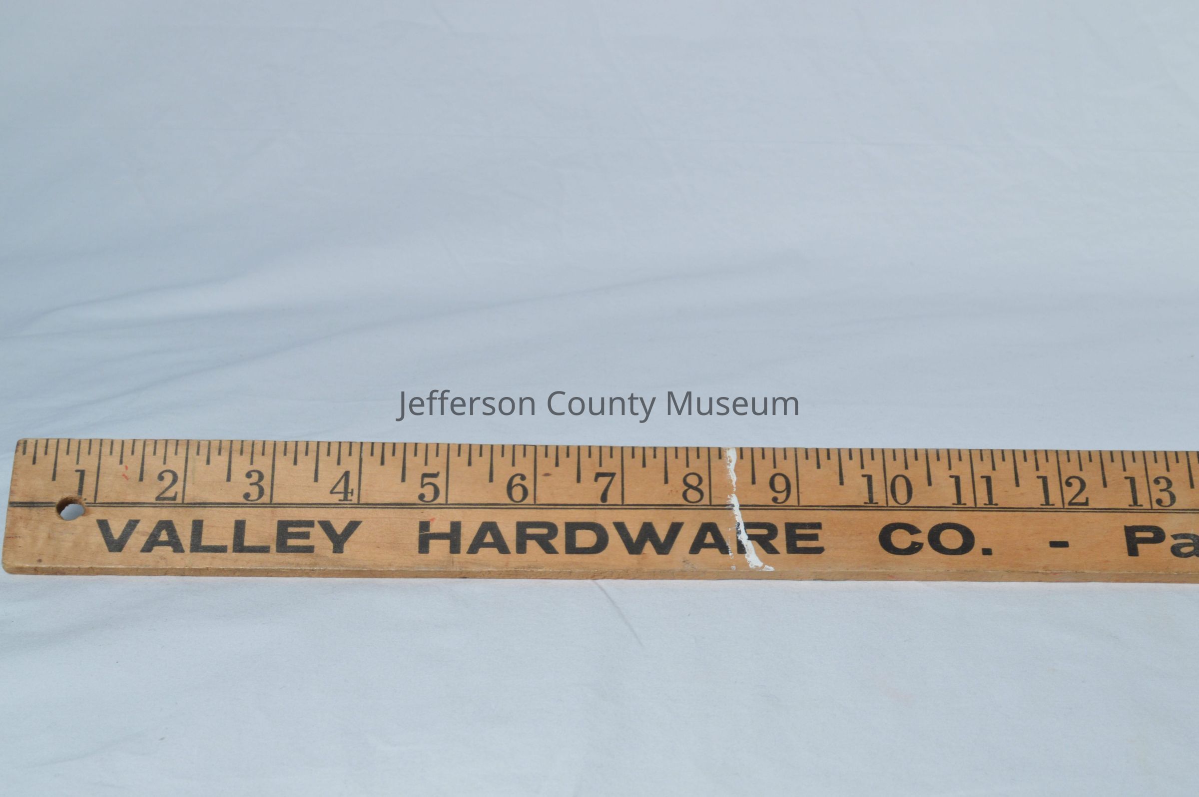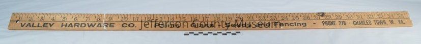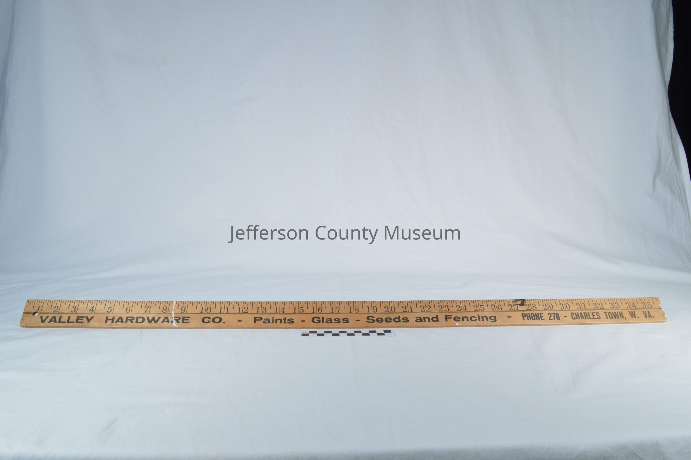 Yardstick with the words VALLEY HARDWARE CO. - Paints - Glass - Seeds and Fencing - Phone 278 - CHARLES TOWN, W.VA. underneath the measuring portion in inches on one side and DAVIS OF BALTIMORE - Pure Paint Products underneath the measuring portion in inches on the other side. Used for advertising and as complimentary gifts for customers.