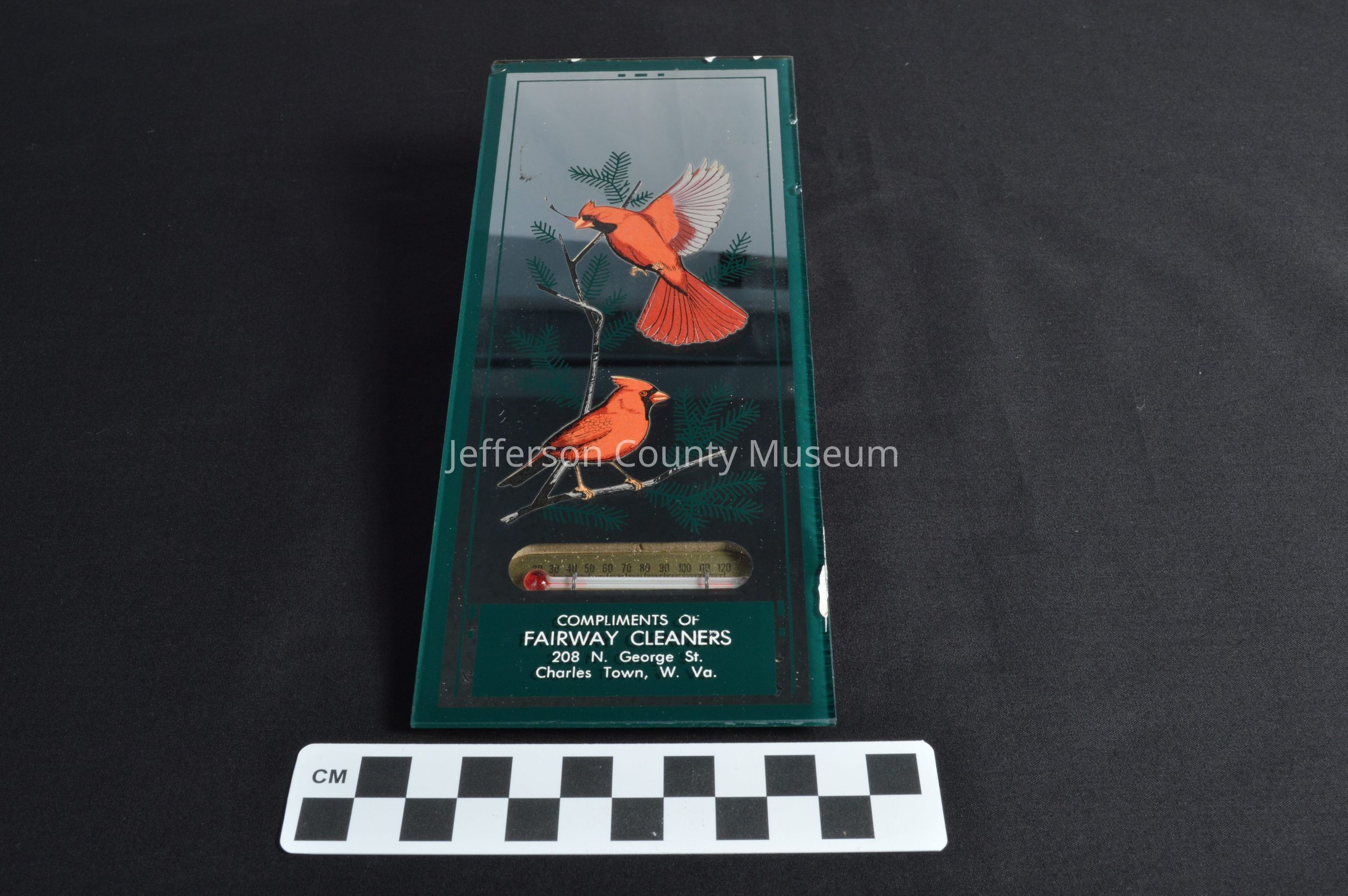 Glass rectangle edged in green with colored picture of two cardinals on pine branches. Thermometer is centered below cardinals. Below thermometer is green sign with white letters that say COMPLIMENTS OF FAIRWAY CLEANERS 208 N. George St. Charles Town, W. Va. Items like this are typically given as gifts to customers.Acquisition