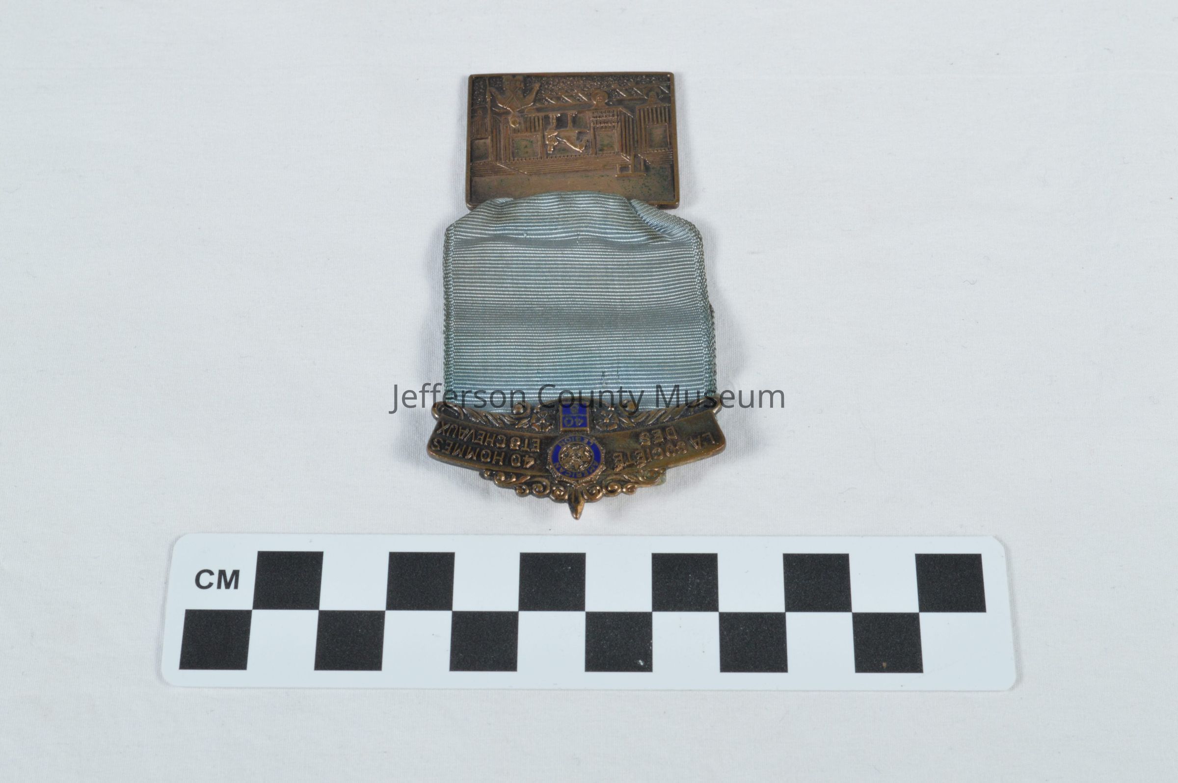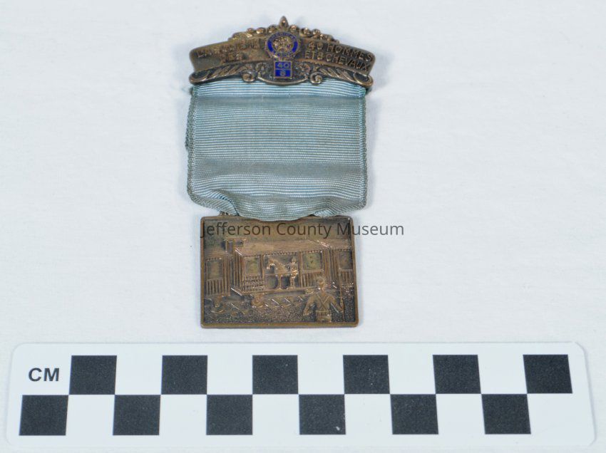 Medal was on left side of # 56, garrison cap. Medal with light blue ribbon. Bar at top has "AMERICAN LEGION" star logo over "40/8". Bar has "LA SOCIETE DES 40 HOMMES ET 8 CHEVAUX". Square medal below ribbon shows horse and man in train car with soldier standing beside train car. See notes for information on the 40/8.Acquisition