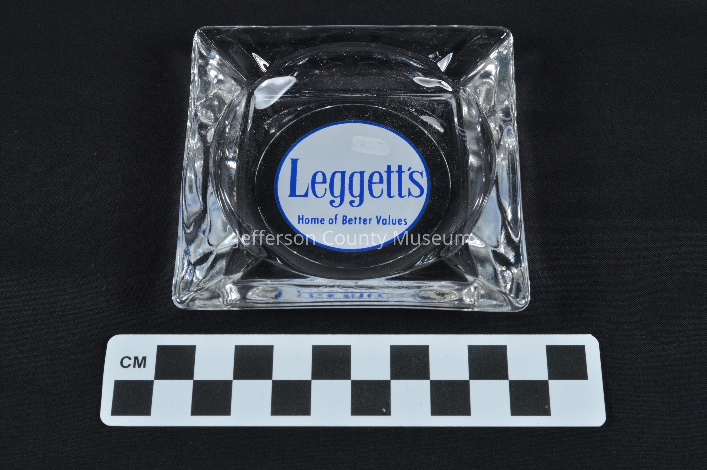 Clear glass ashtray, advertising piece from Leggett's. Reverse painting is white circle, outlined in blue, with blue lettering: "Leggett's Home of Better Values".Acquisition