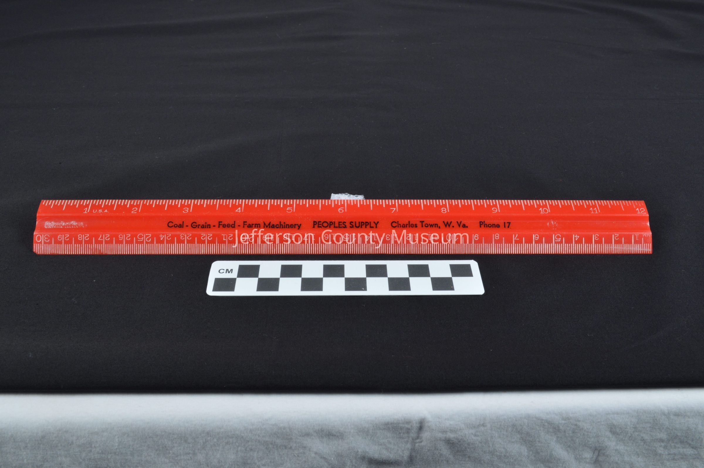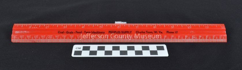 Red plastic ruler, advertising object from Peoples Supply. One edge has inches marked in white; opposite edge has millimeters marked in white. Stamped in black in center of ruler: "Coal - Grain - Feed - Farm Machinery PEOPLES SUPPLY Charles Town, W. Va. Phone 17".Acquisition