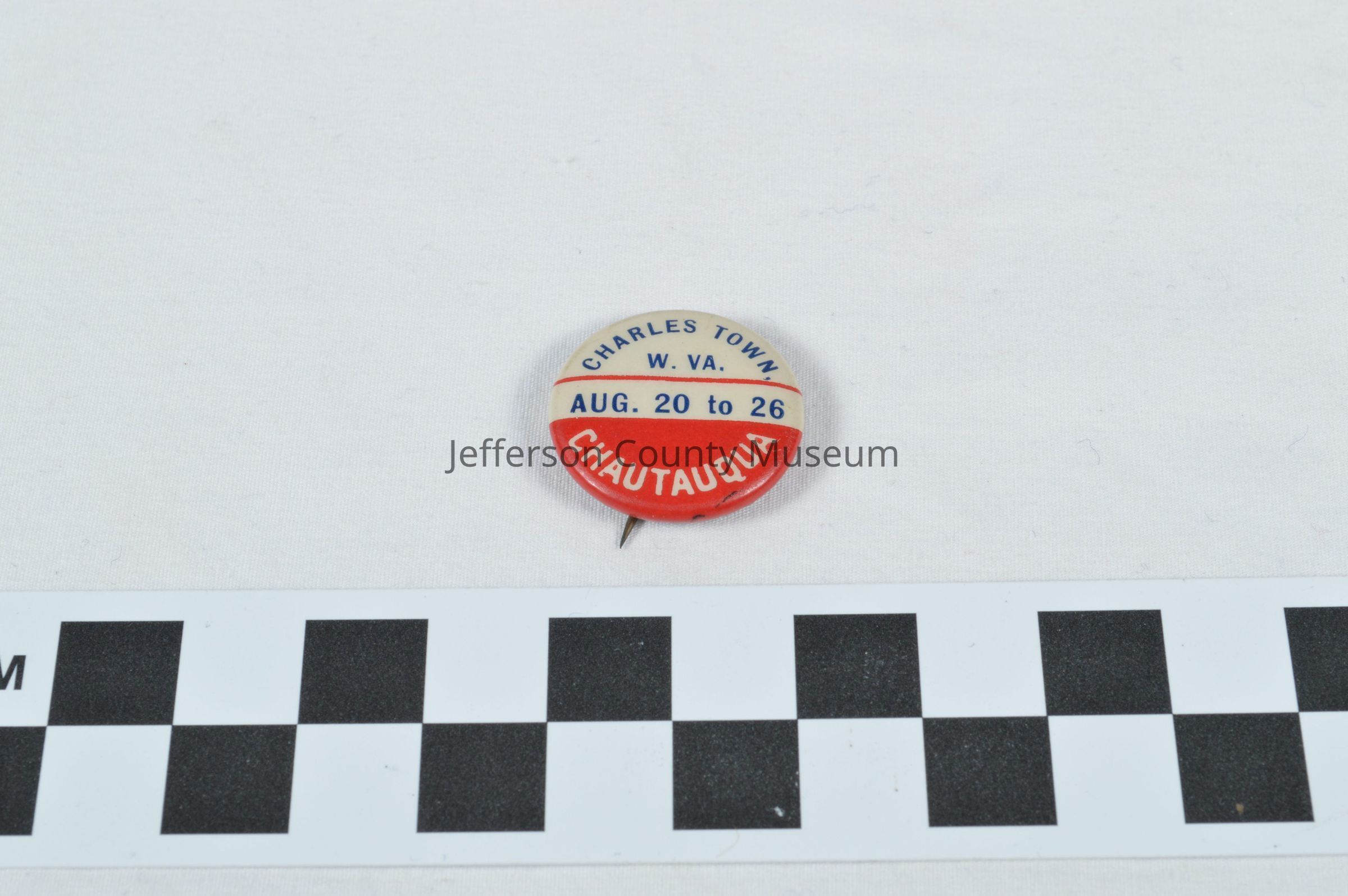 Small, round pin advertising "Chautauqua". Top half of pin is white with blue lettering: "CHARLES TOWN W. VA. AUG. 20 to 26"; bottom half of pin is red with white lettering: "CHAUTAUQUA". Pin measures about 0.8" in diameter.