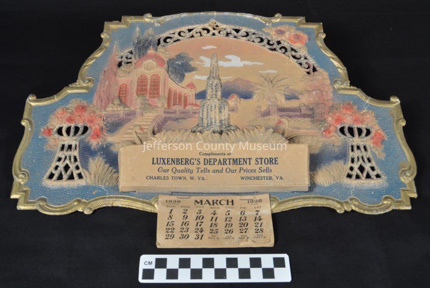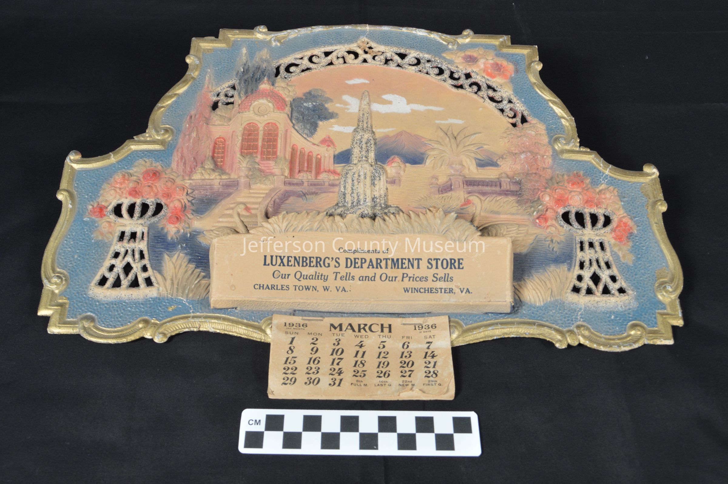Elaborate 1936 advertising calendar from Luxenberg's Department Store. Embossed and dyed lightweight cardboard is embossed with a building, pair of swans, and plants, and outlined with filigree and glitter. Paper tear-away calendar is stapled along bottom edge, and begins with the month of March and runs through December. Paper "pocket" above calendar is stamped: "Compliments of LUXENBERG'S DEPARTMENT STORE Our Quality Tells and Our Prices Sells CHARLES TOWN, W. VA. WINCHESTER, VA."Acquisition
