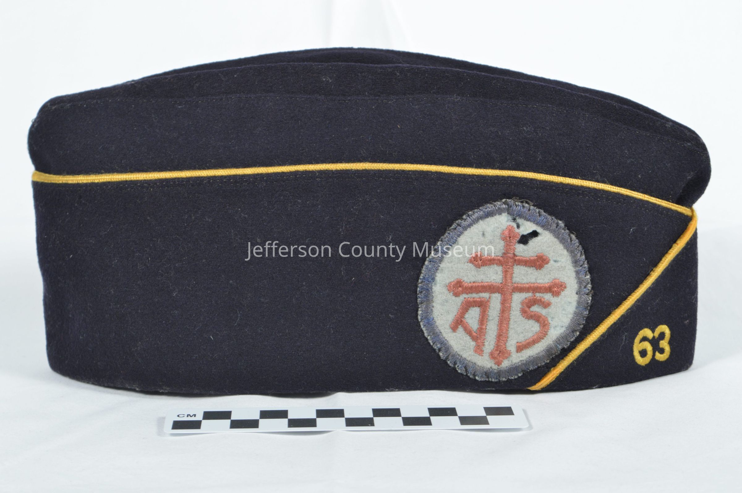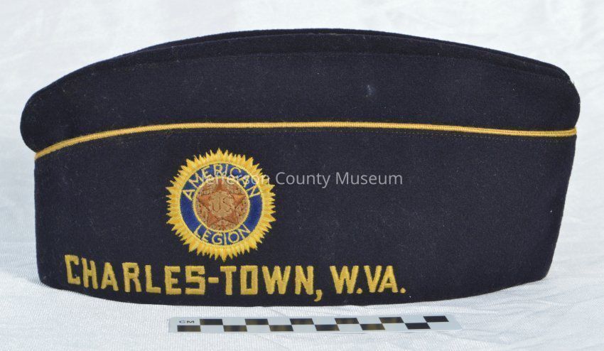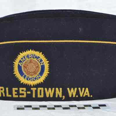 Dark blue wool garrison cap worn by Edward Dabney Tolbert. American Legion logo embroidered on left side of cap; embroidered in gold below logo: "CHARLES-TOWN, W.VA." Circular patch is stitched on right side of cap, it is light blue background with a brown Cross of Lorraine and the letters "A" and "S" on either side of cross [see Notes & Legal]; embroidered in gold, to the right of the patch: "63". Inside of cap is lined with gold silk and has a leather band that is embossed: "EMBLEM DIV. NATIONAL HEADQUARTERS THE AMERICAN LEGION INDIANAPOLIS". Adhesive backed address label is adhered to leather band, to the left of the embossing: "James A. Tolbert P. O. Box 651 Charles Town, WV 25414-0651". The AS stood for Advance Sector (there also was Intermediate and Base). All three sectors were separate commands within the American Expeditionary Forces. The personnel posted to these sectors generally were support troops, which included Engineer, Quartermaster, Medical, Signal Corps, Military Police, Motor Transport, Ordnance, etc.Acquisition