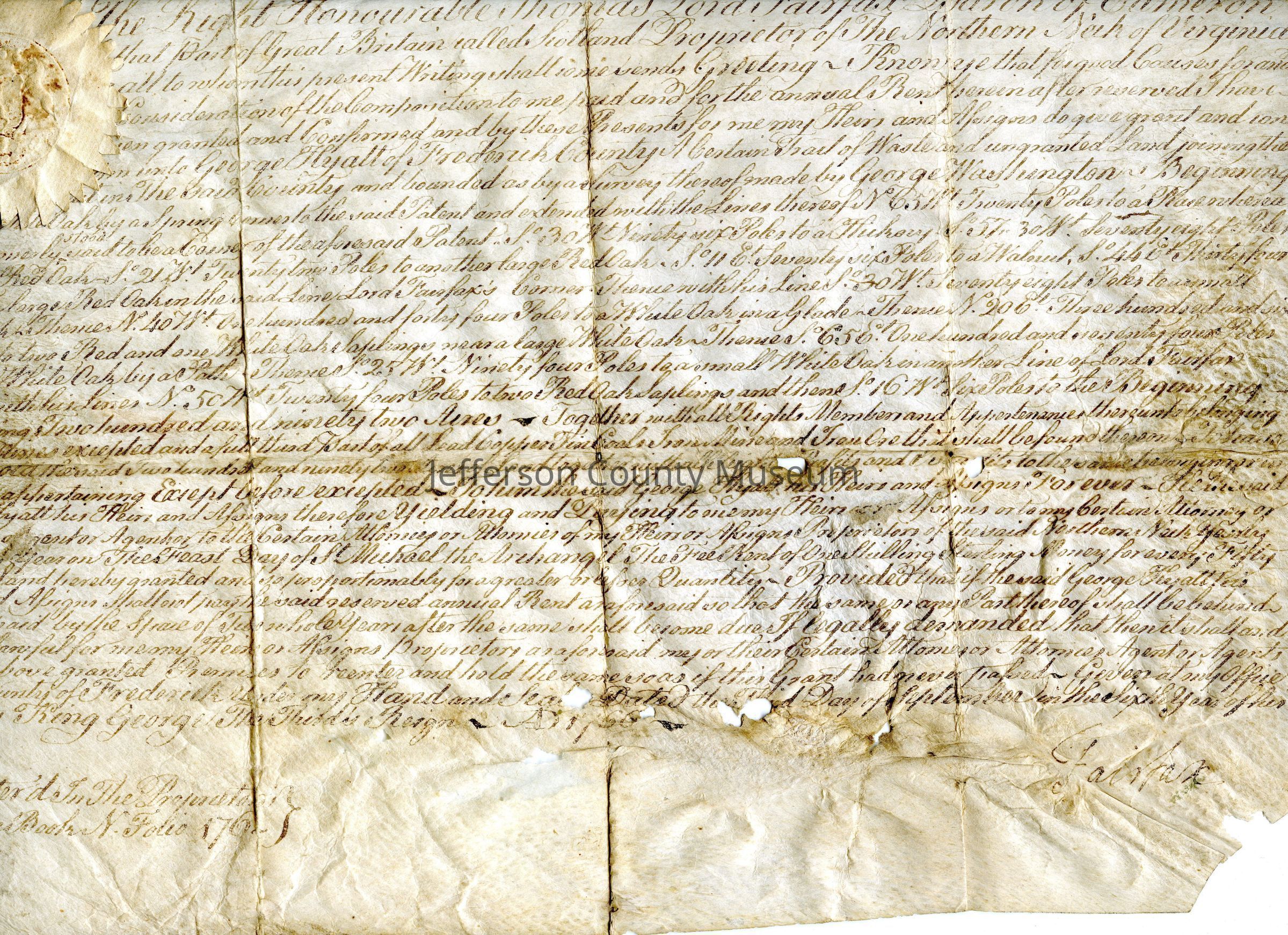 Land grant handwritten on parchment from Lord Fairfax, Baron of Cameron, to George Hyatt, granting property in Frederick County, Virginia. Mentions George Washington as surveyor. Seal pasted in upper left corner.Acquisition