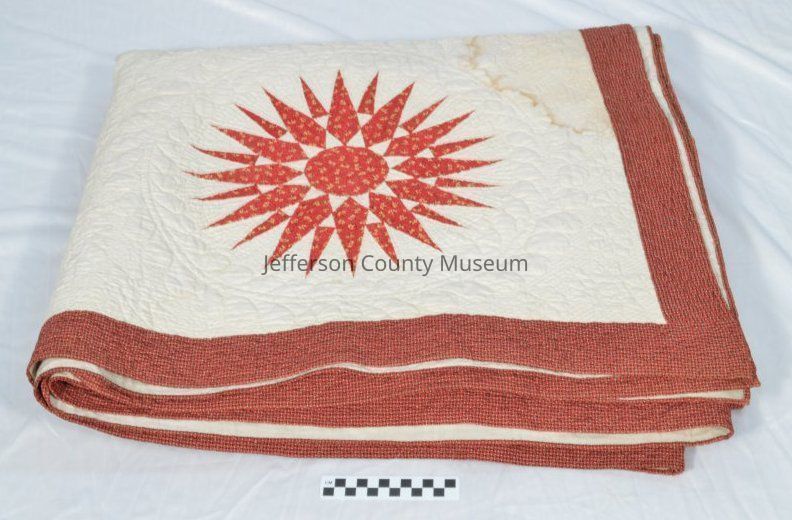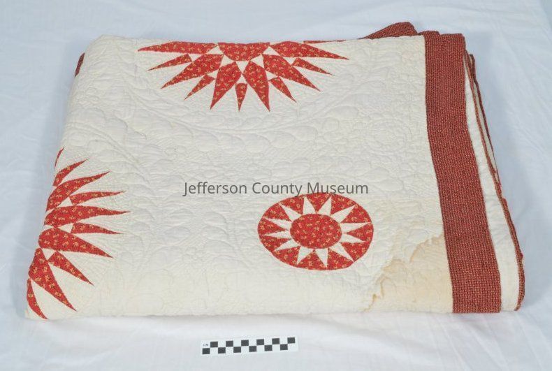 Sunburst pattern cotton and muslin quilt. Turkey red cottons and white cottons were used for pattern; 2.5" border of turkey red. 18 - 16.5" circular pieced blocks with a sunburst design; 4 - 9" smaller sunbursts in between large circles. Backing is three segments of muslin. Finished by lapping border narrowly over backing. Low loft cotton batting. Quilting is dense with 6-7 stitches per inch. Quilting pattern is to the shape in the sunbursts; .25" parallel lines; diagonals 1/16 apart; feathered wreaths, small sunbursts, and small flowers.Acquisition