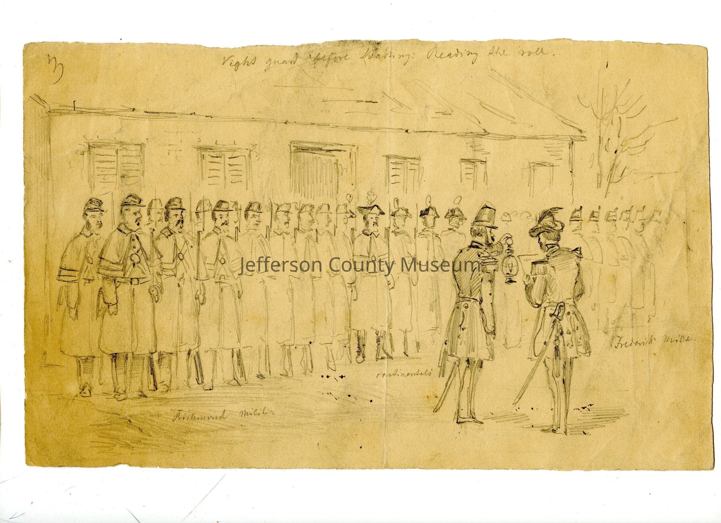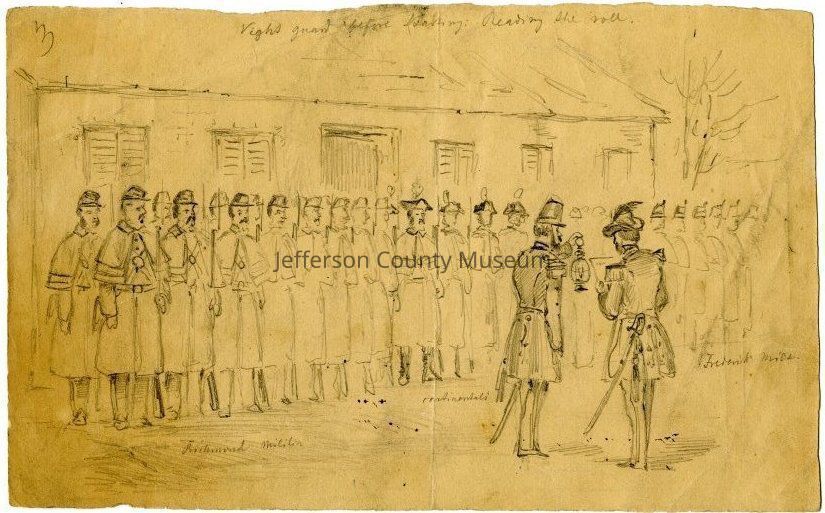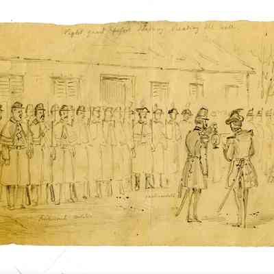This sketch was later engraved and published in the December 10th issue of Frank Leslie's Illustrated Paper with the title "Meeting the Picket Guard - The Officer Reading the Roll and Giving his Directions Previous to the Guard Going on Duty for the Night." Unlike the engraving, however, this drawing provides specific names for the Virginia militia detachments forming the picket guard, identifying them left to right as "Richmond Militia" (Richmond Greys), "Continentals" (Continental Morgan Guard from Winchester), and "Frederick Militia" (from Frederick County, Virginia).