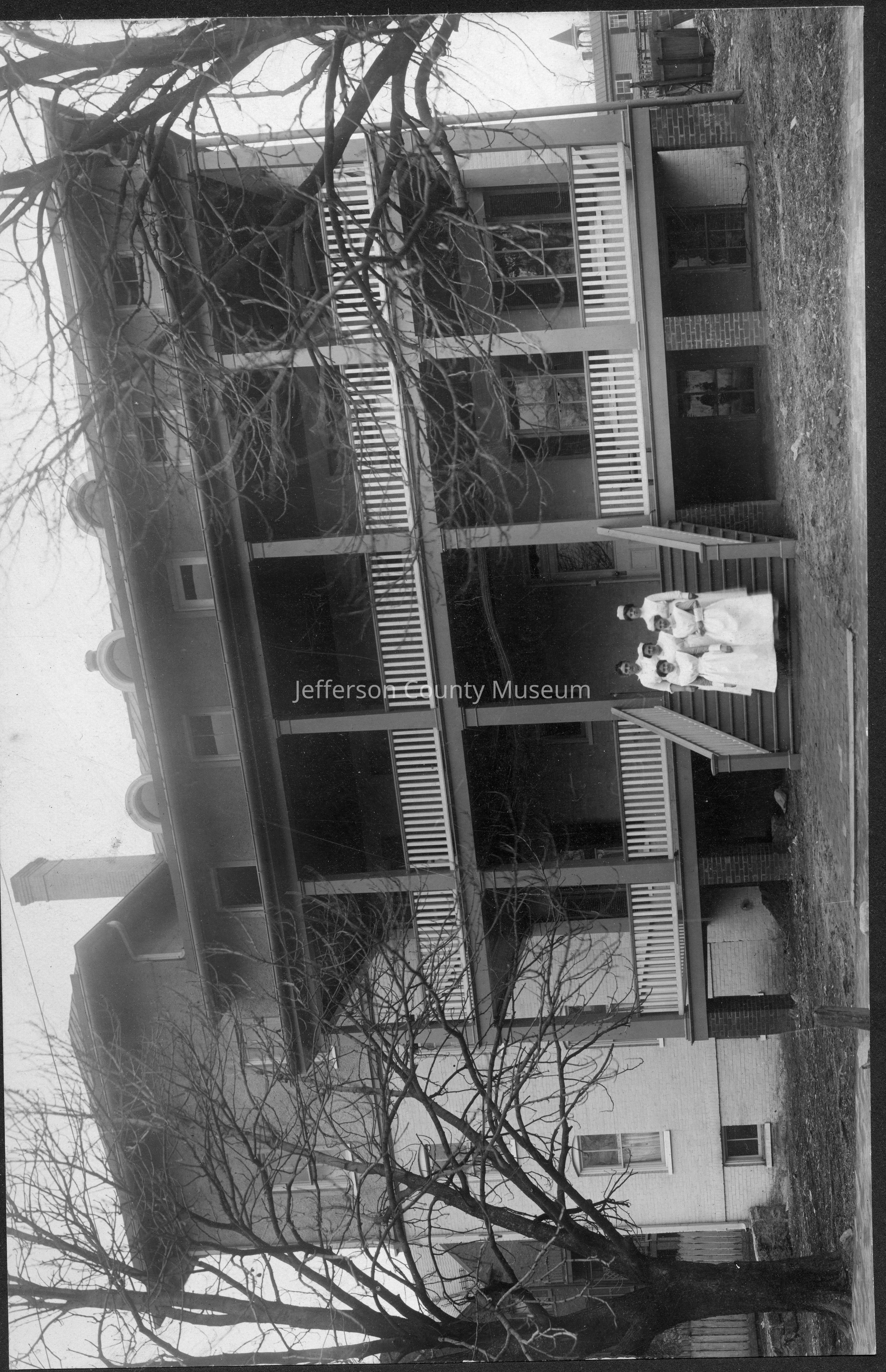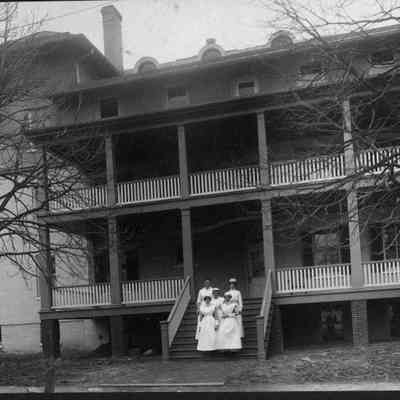 Outside the first Charles Town Hospital. Five nurses standing on the steps. Glued to black cardboard.
