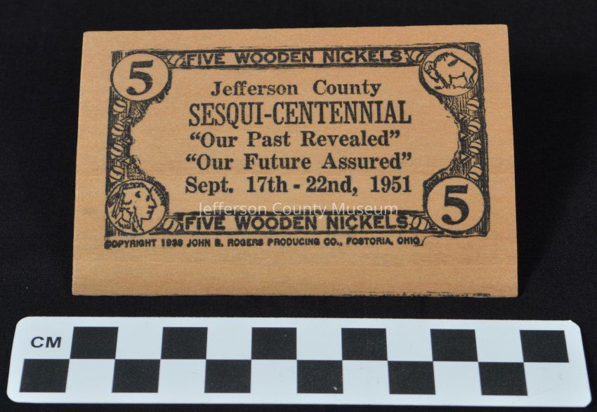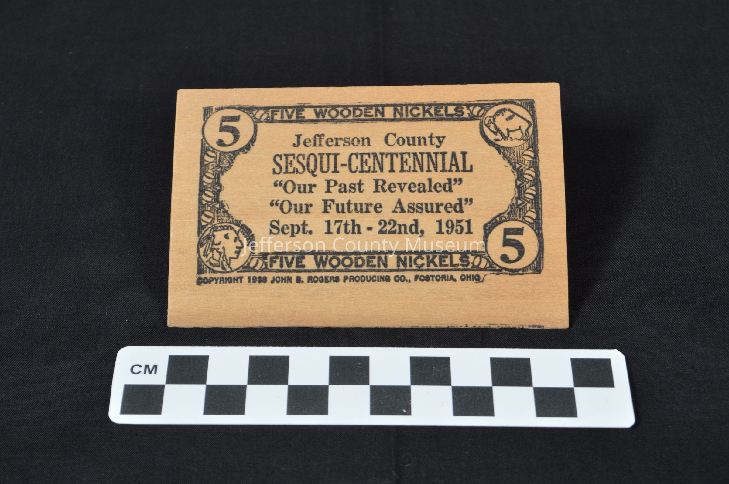 Rectangular wooden nickel. Two corners have the number 5 printed, and the other two have images of a buffalo and a Native American profile. On the front text reads: Five WOODEN NICKELS Jefferson County SESQUI-CENTENNIAL "Our Past Revealed" "Our Future Assured" Sept. 17th-22nd 1951. Copyright 1939 John & Rogers Producing Co., Fostoria, Ohio. On the back text reads: 150 Years of Progress This Wooden Nickel will be accepted at face value by any merchant in this county until September 22nd, 1951. Unbroken, it will be redeemed at face value at the Bank of Charles Town; the Peoples Bank of Charles Town, or the Blakeley Bank & Trust Co., Ranson on or before 12 noon, on September 22, 1951. GUY DAVIS, Novelties Comm.Acquisition