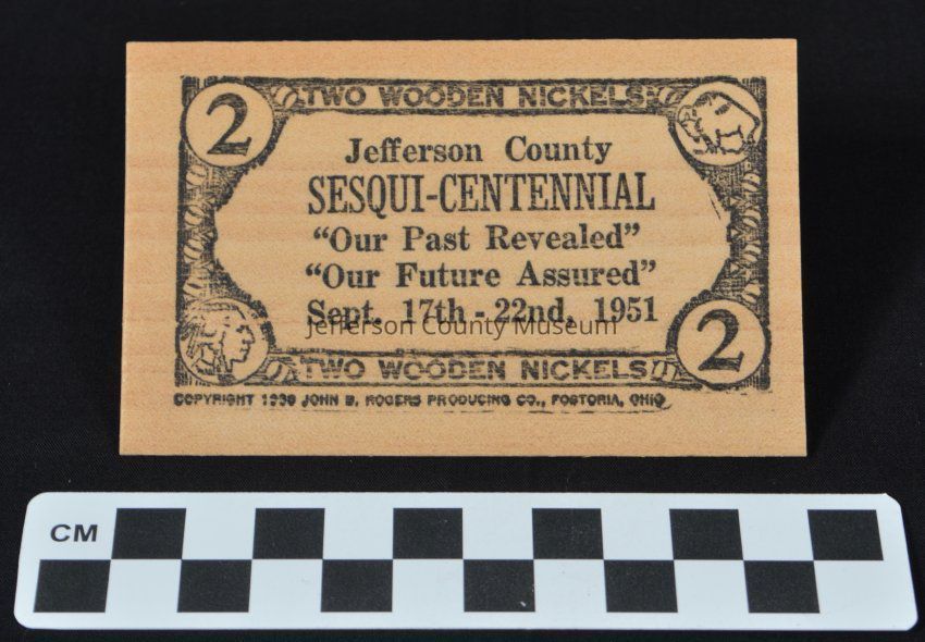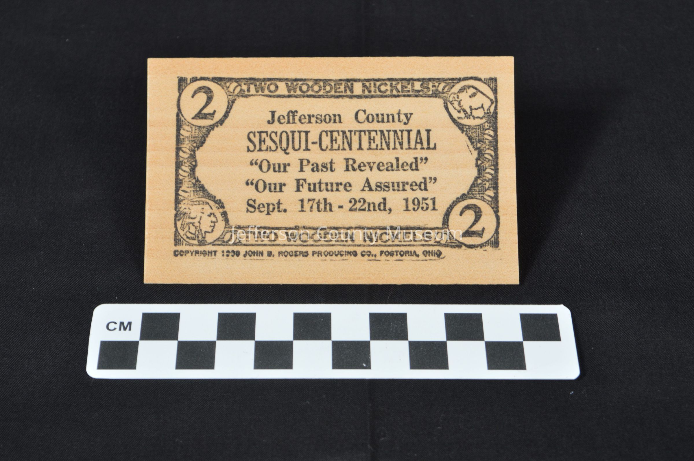 Rectangular wooden nickel. Two corners have the number 2 printed, and the other two have images of a buffalo and a Native American profile. On the front text reads: TWO WOODEN NICKELS Jefferson County SESQUI-CENTENNIAL "Our Past Revealed" "Our Future Assured" Sept. 17th-22nd 1951. Copyright 1939 John & Rogers Producing Co., Fostoria, Ohio. On the back text reads: 150 Years of Progress This Wooden Nickel will be accepted at face value by any merchant in this county until September 22nd, 1951. Unbroken, it will be redeemed at face value at the Bank of Charles Town; the Peoples Bank of Charles Town, or the Blakeley Bank & Trust Co., Ranson on or before 12 noon, on September 22, 1951. GUY DAVIS, Novelties Comm.Acquisition