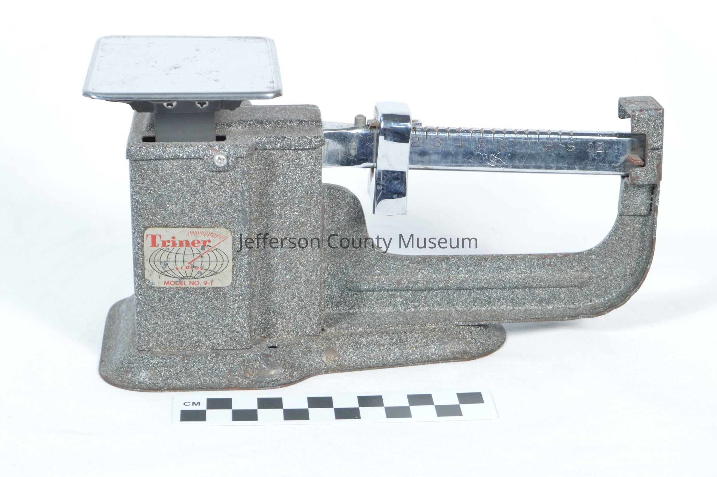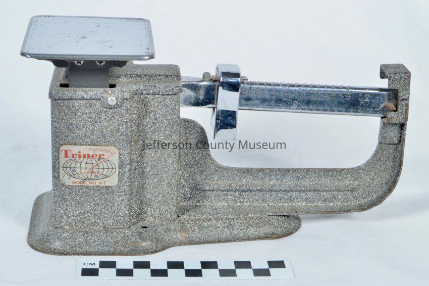 Triner Scales Model No. 9-1 for weighing mail to determine correct postage. Gray metal with bar that raises and lowers depending on the weight of the mail and markings for ounces up to 9 ounces; metal weight that can be moved to balance the bar at the appropriate ounce marking.Acquisition