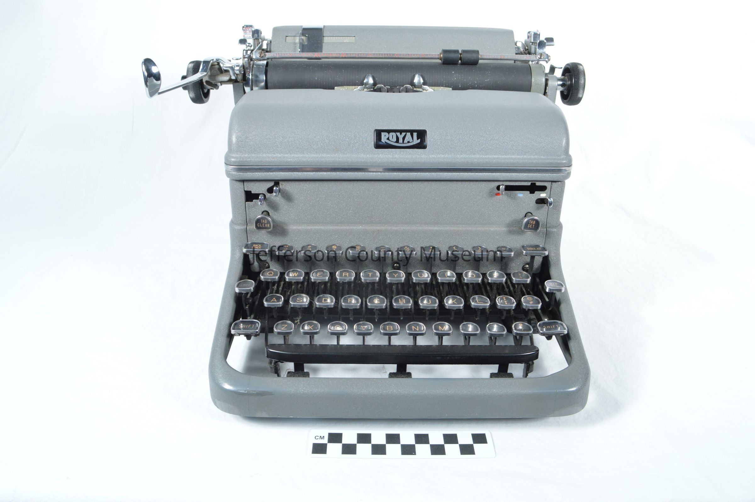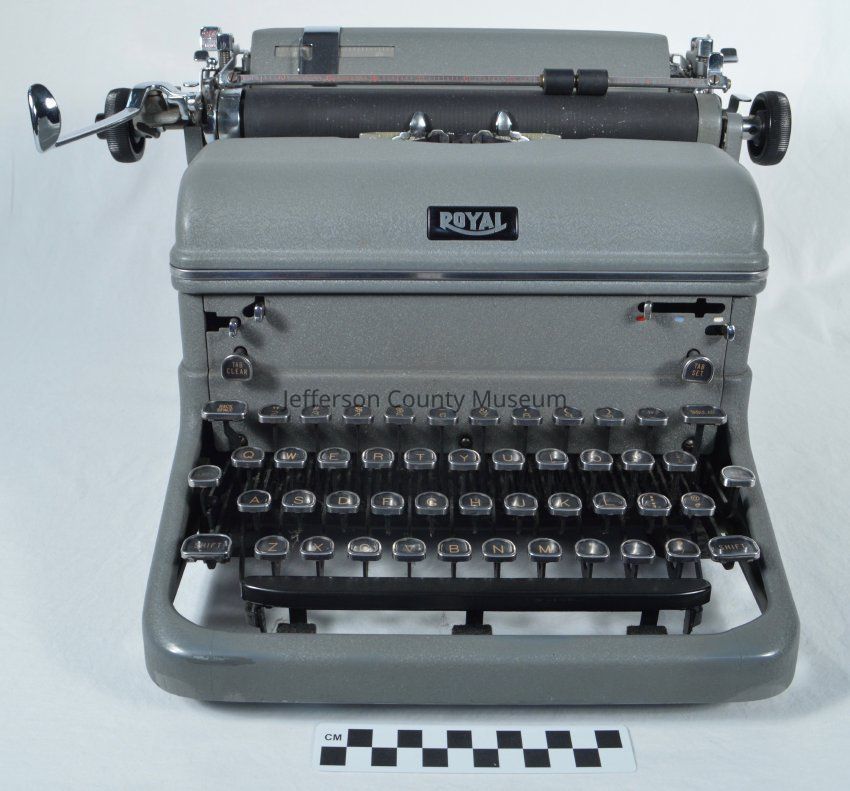 Royal Model KMM (Magic Margin Touch Control) manual typewriter. Gray metal; keys appear to be original and are black with orange letters. The KMM introduced Royal's famous and patented Magic Margin system, whereby holding down the right or left margin lever and sliding the carriage to the desired location "magically" set the margin.Acquisition